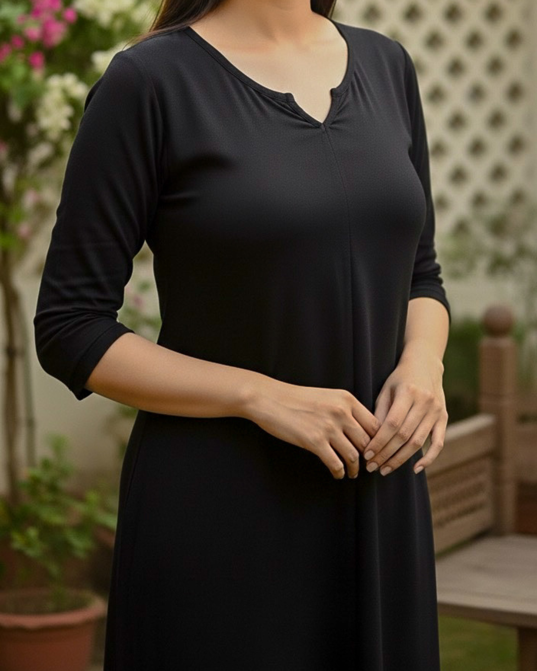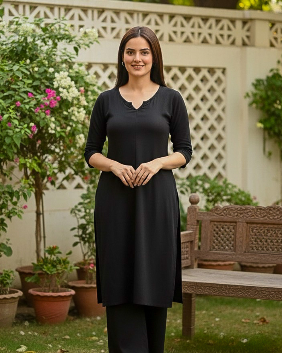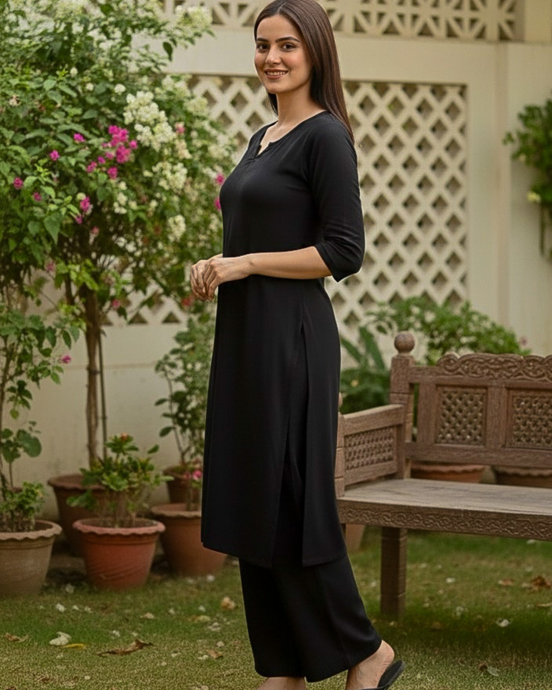 Every wardrobe needs the perfect black staple, and this is it. This effortlessly chic 2-piece solid black suit combines simplicity with supreme comfort. It features a soft, straight-cut tunic and comfortable matching trousers. The minimal design is elevated by a flattering V-neckline with a subtle notch detail. Dress it up or down. This breathable, versatile set is ideal for daily wear, travel, or quick elegant office styling.