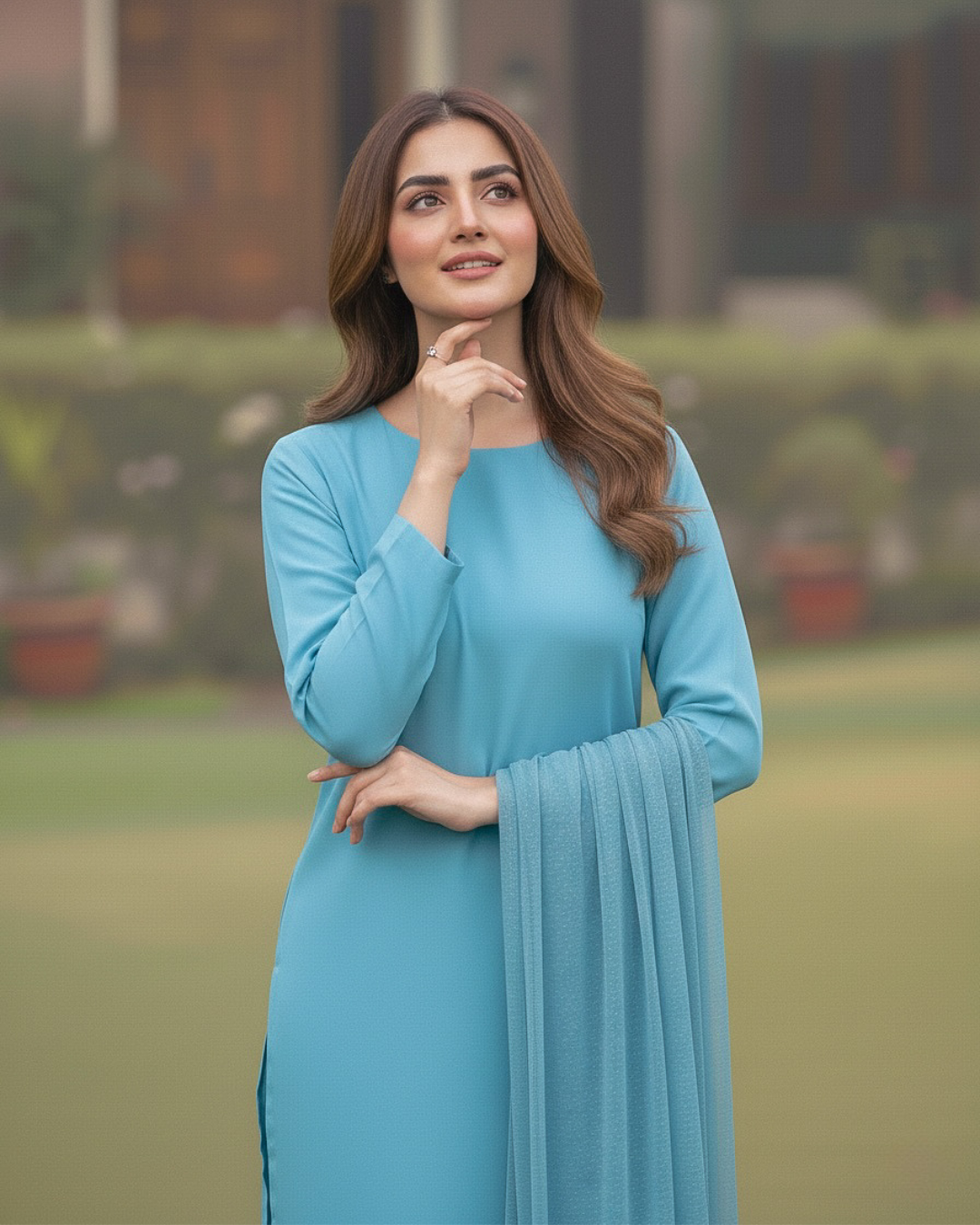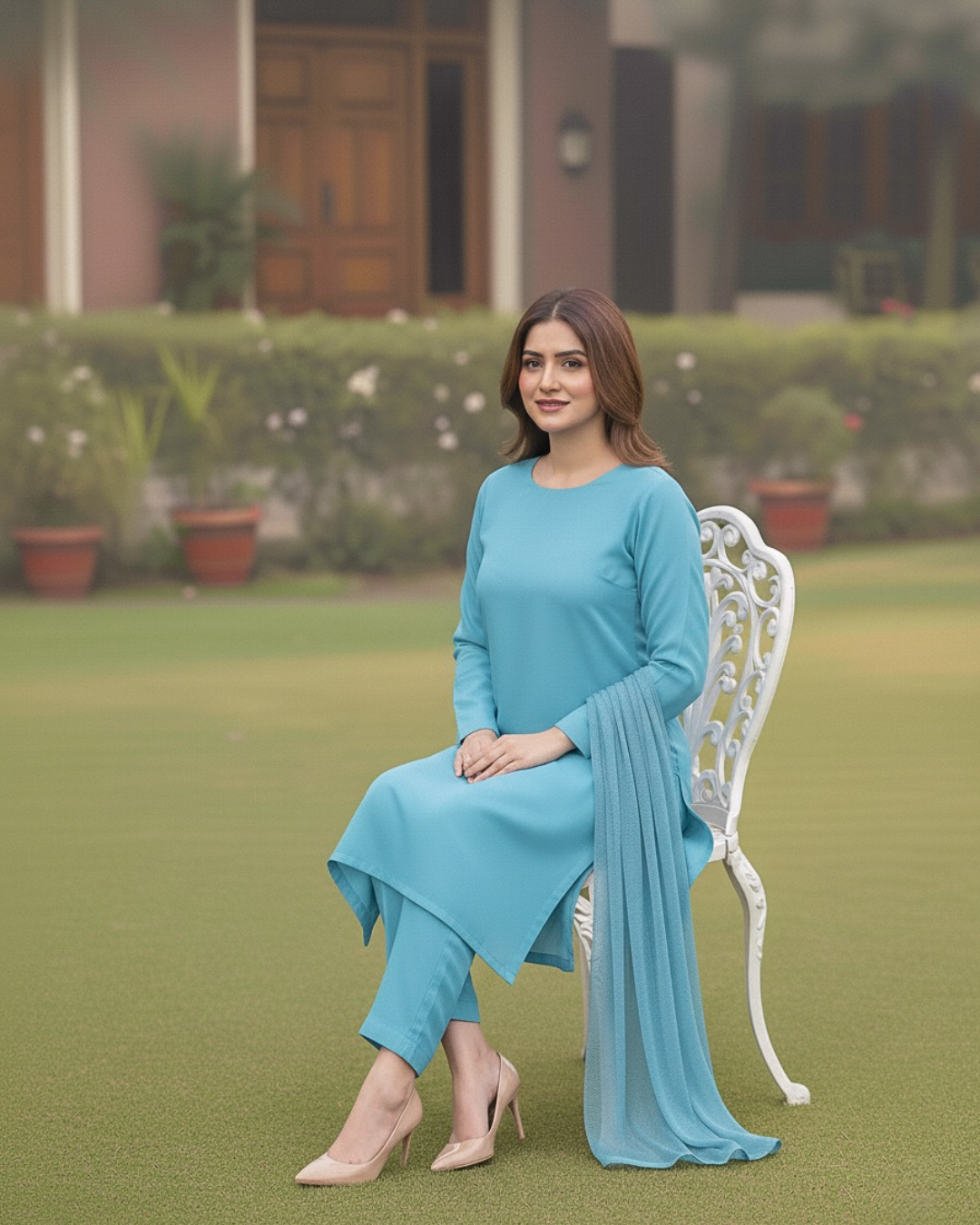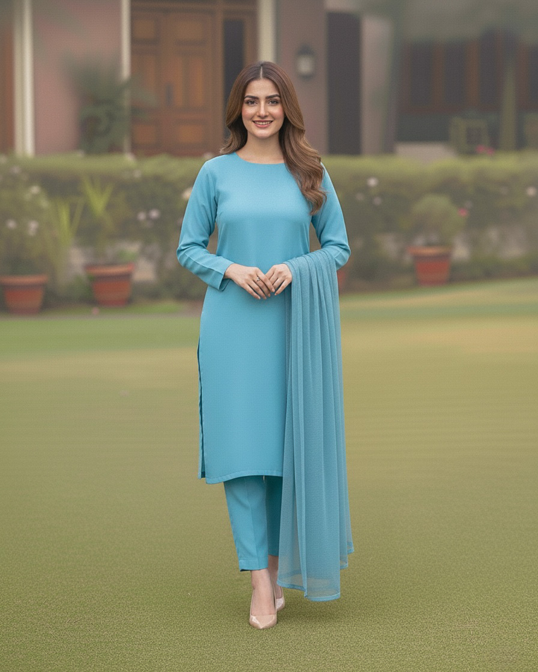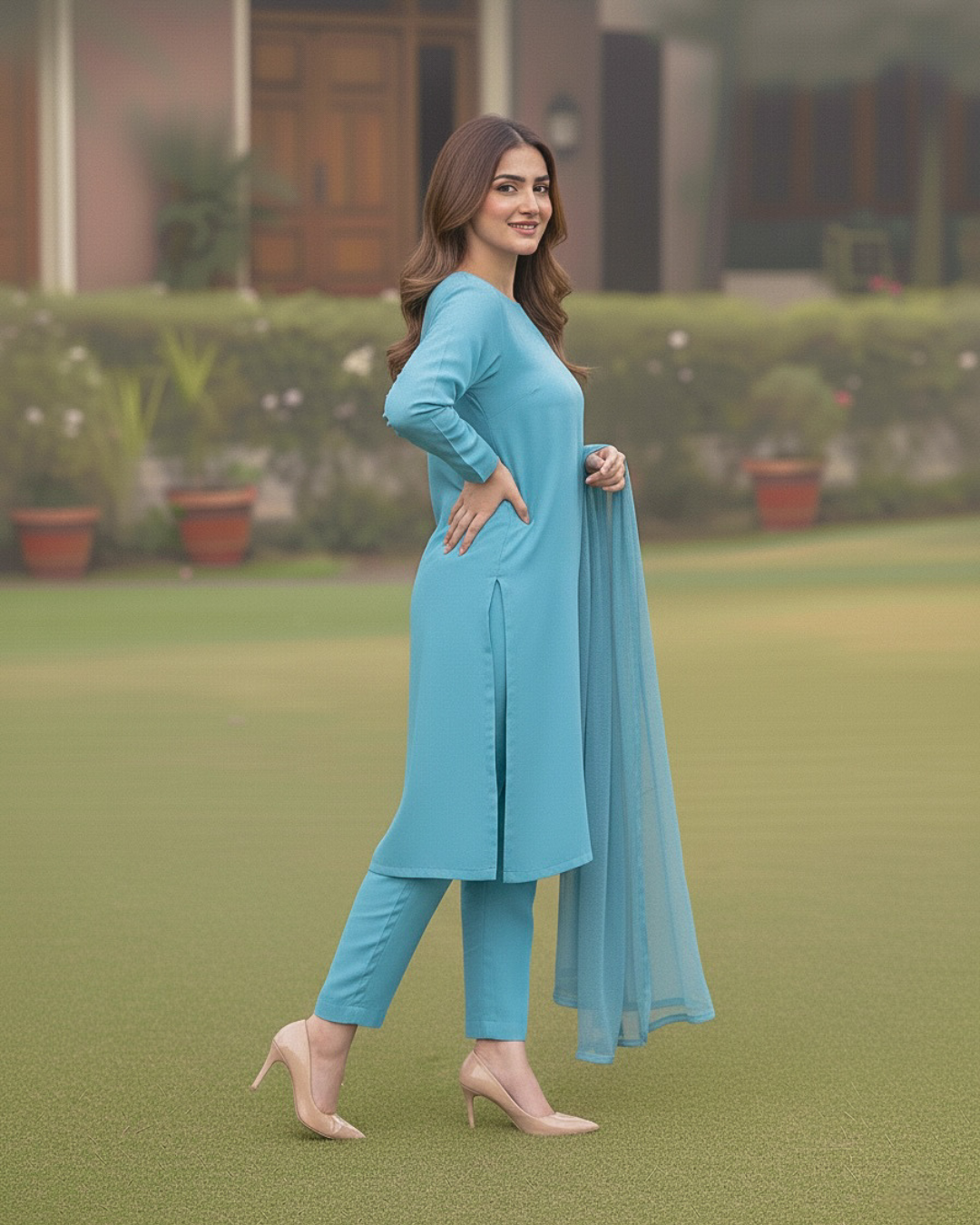 Bring the calm of the sea to your wardrobe with this stunning Aqua Blue 3-piece set. This solid suit features a straight-cut, mid-length kameez and tailored straight trousers, crafted from a smooth, premium fabric. Complemented by a matching sheer chiffon dupatta, this elegant and minimal design is perfect for transitioning from office hours to evening gatherings with effortless style.