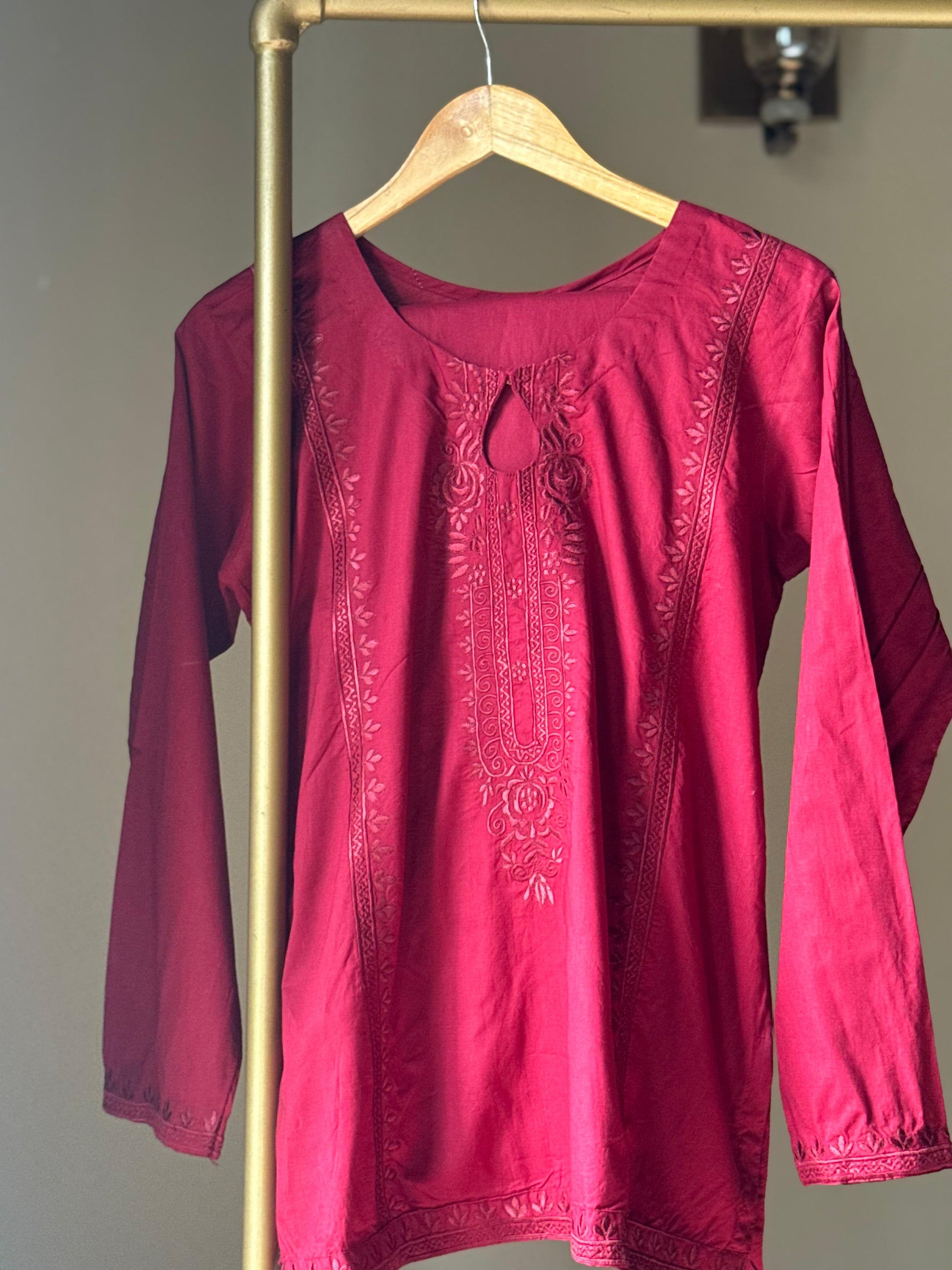 This versatile outfit features a short embroidered kurti and straight long trousers, expertly stitched from high-quality cotton lawn fabric — perfect for staying cool during the summer season. Light embroidery and delicate lace detailing add a graceful touch to the bold berry red color, making it an ideal choice for lunch dates, office wear, or festive gatherings.