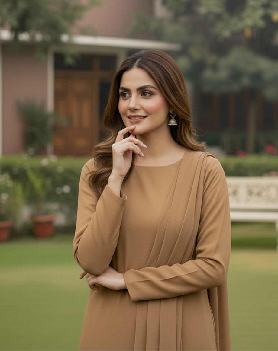 Bring the calm of the sea to your wardrobe with this stunning camel brown 3-piece set. This solid suit features a straight-cut, mid-length kameez and tailored straight trousers, crafted from a smooth, premium fabric. Complemented by a matching sheer chiffon dupatta, this elegant and minimal design is perfect for transitioning from office hours to evening gatherings with effortless style.
