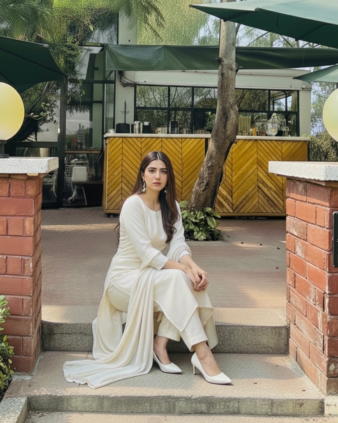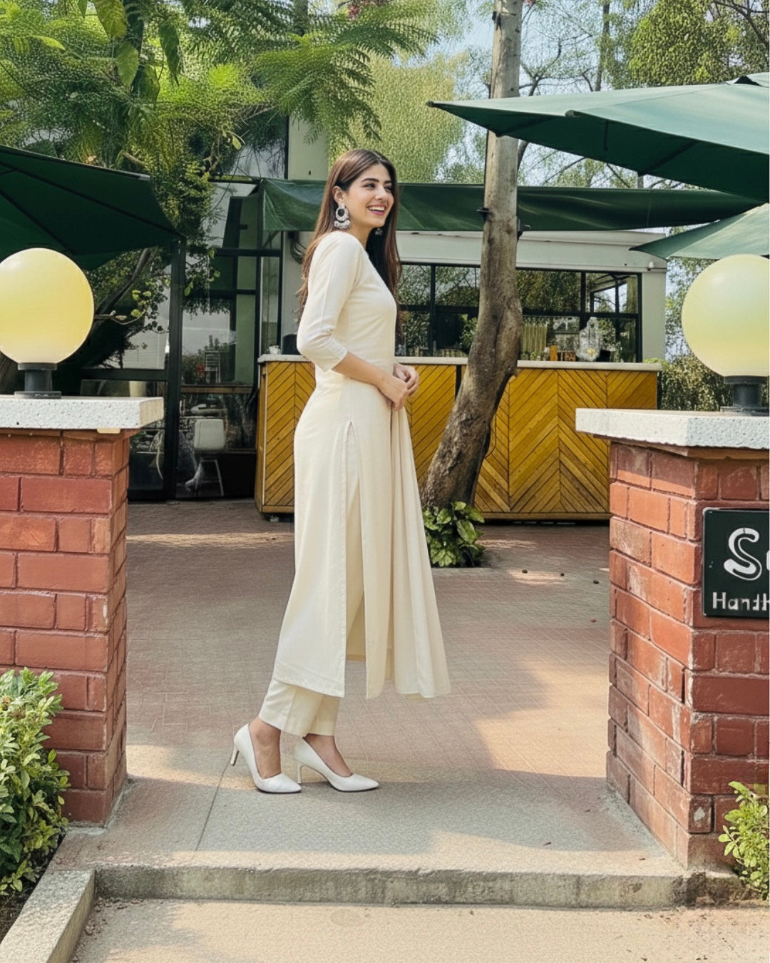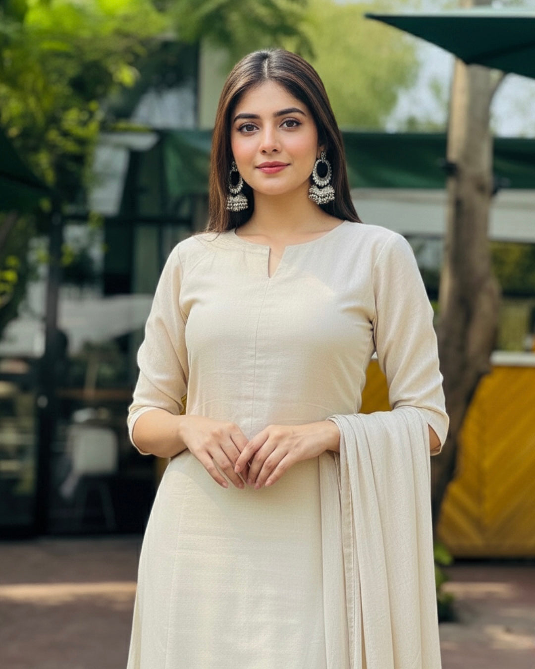 Meet your new wardrobe staple! This crisp Ivory White 3-piece suit defines effortless elegance. Featuring a straight-cut, minimal kameez with subtle tailoring, it’s paired with smart, tailored trousers and a matching solid dupatta. The breathable fabric and clean lines make it the perfect choice for office days, casual outings, or formal lunches where understated style is key.