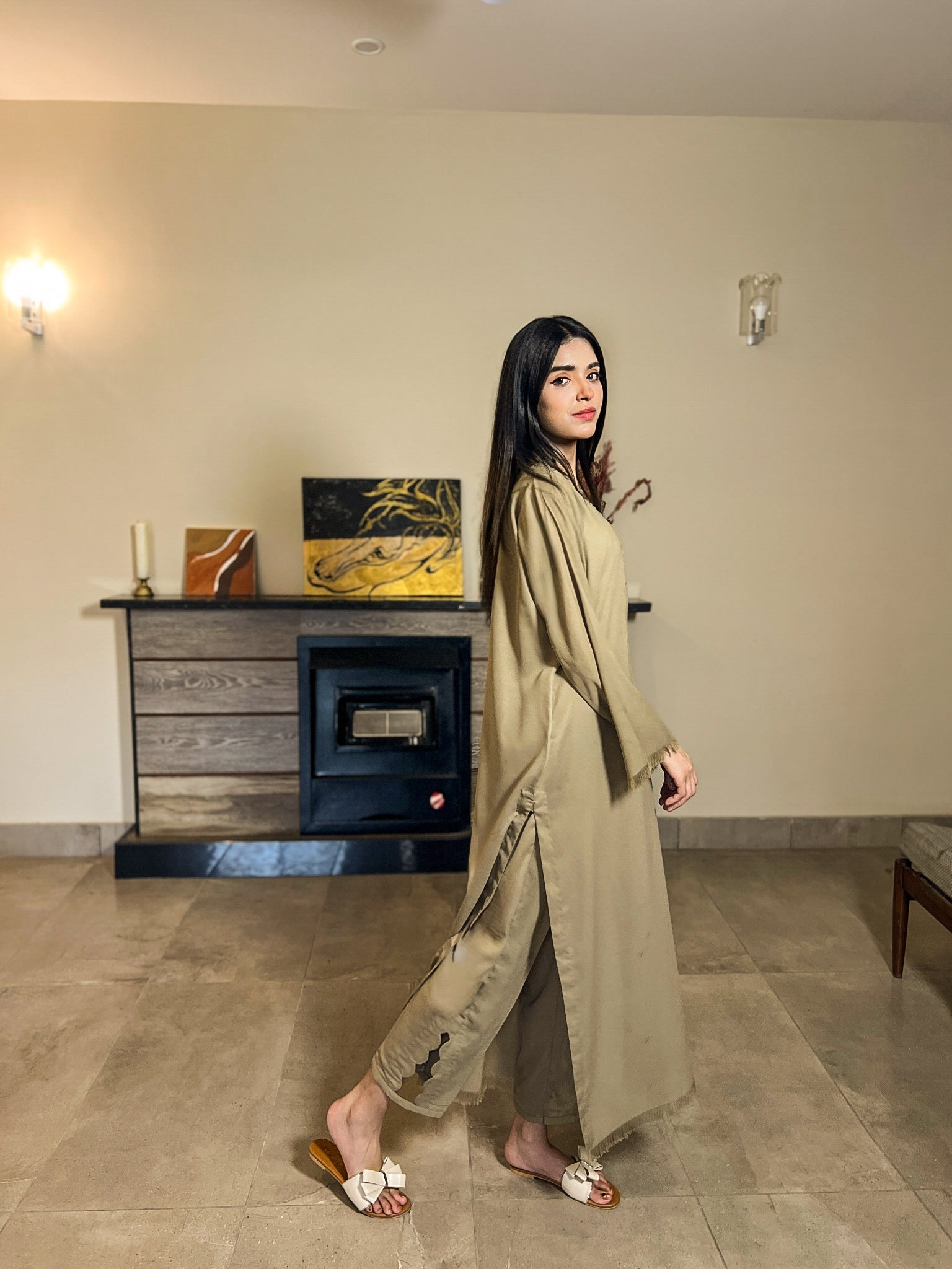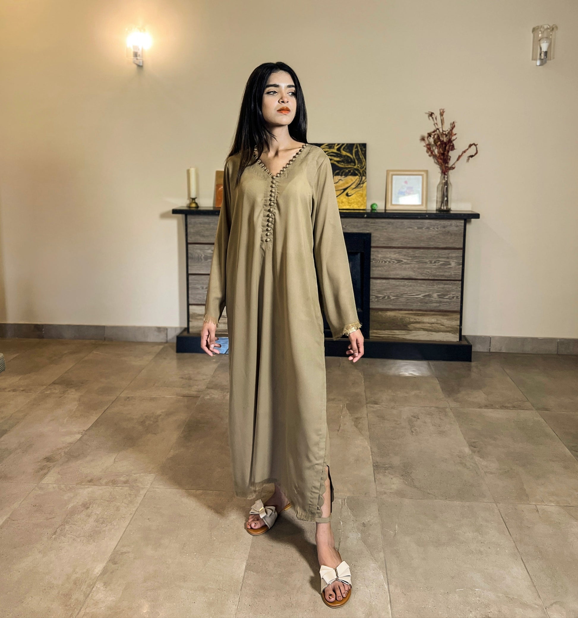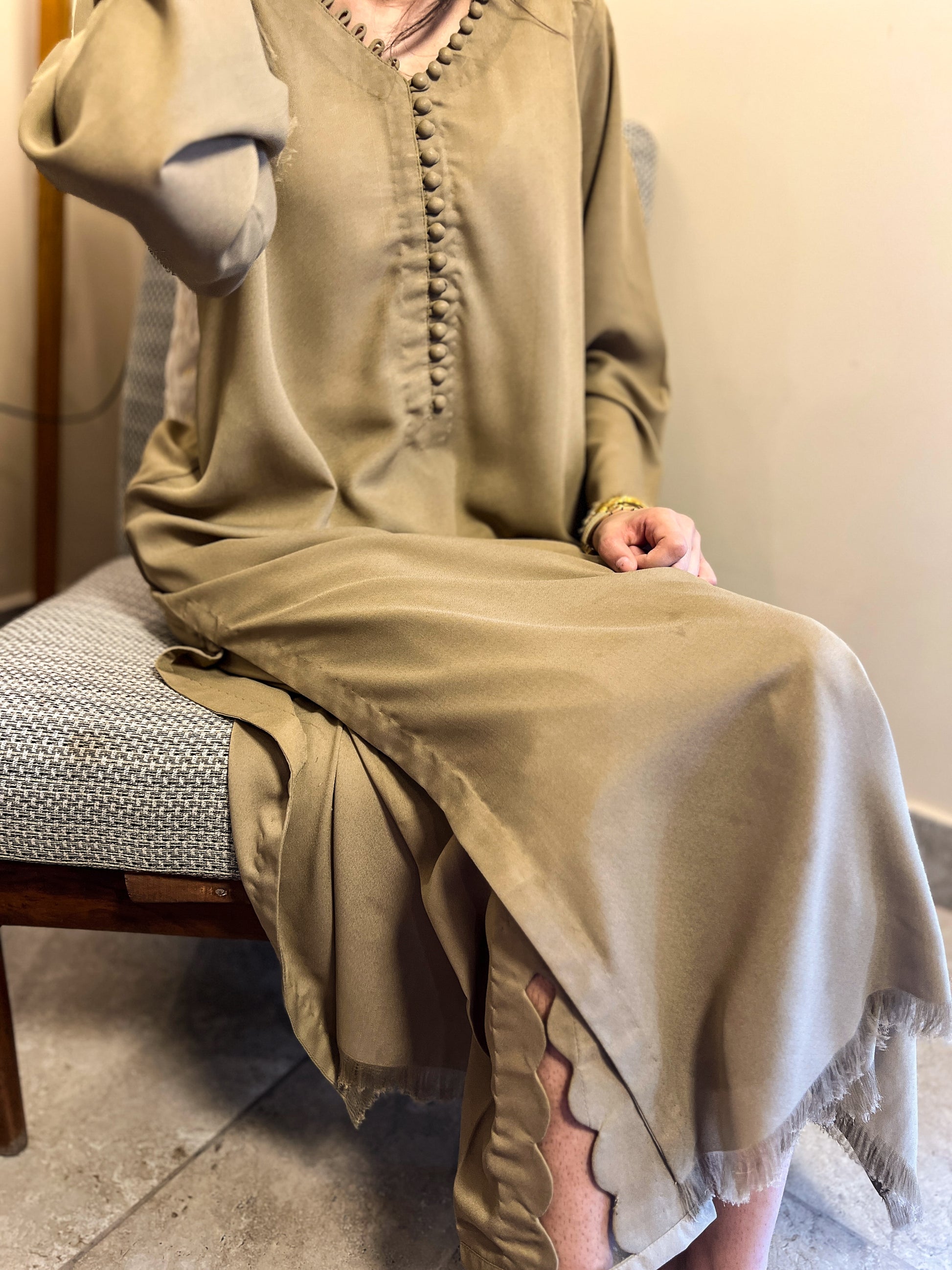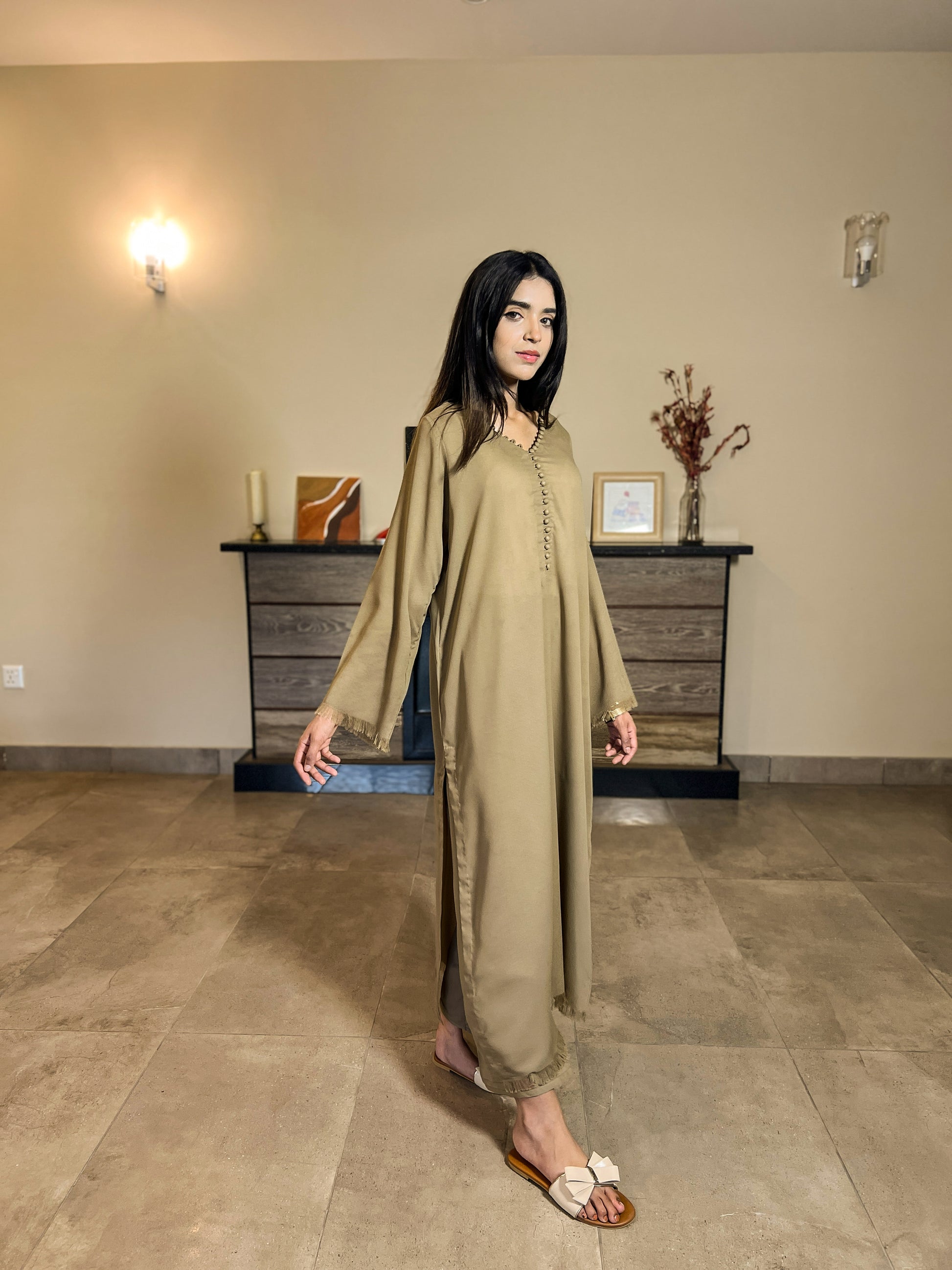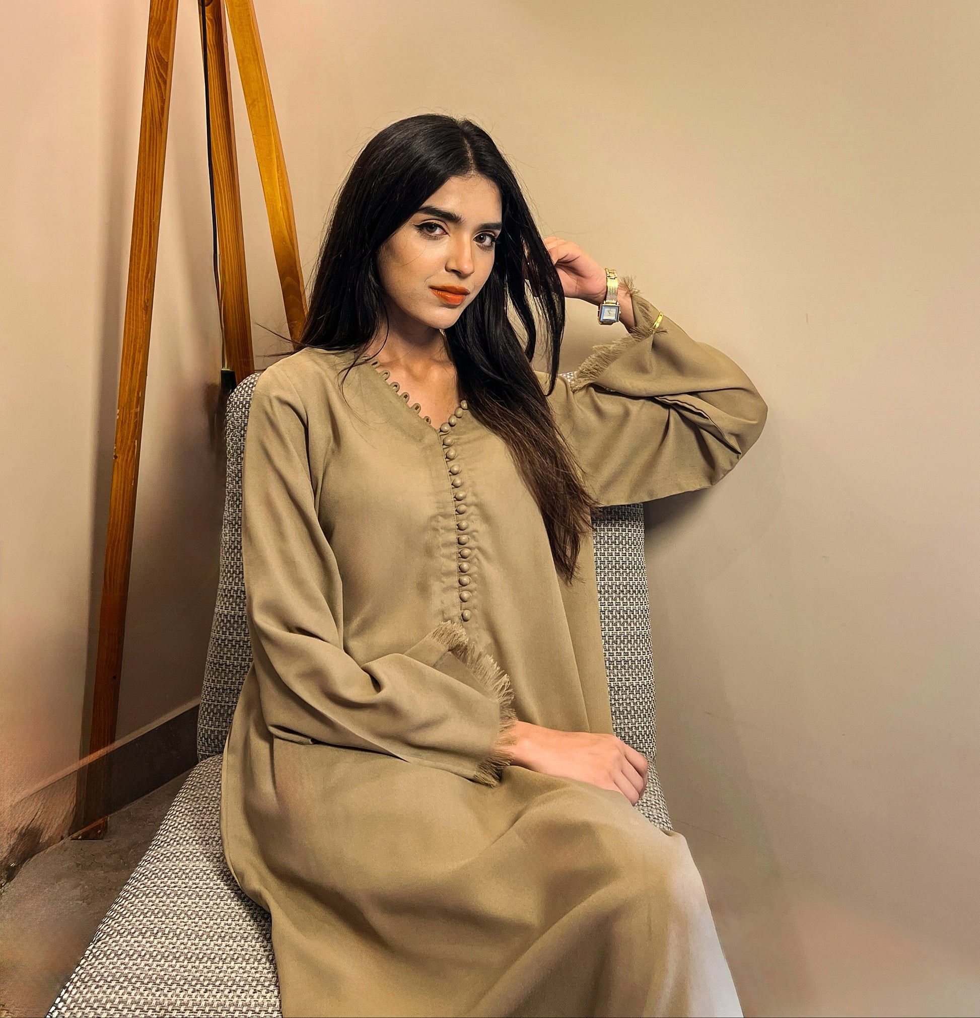 Elevate your wardrobe with this earthy sand solid that blends understated charm with comfort. Featuring delicate button & loop detailing along the neckline and Fringed full sleeves, this design flatters while keeping things relaxed and minimal. Its breathable fabric and flowy cut make it an ideal choice for casual lunches or office days.