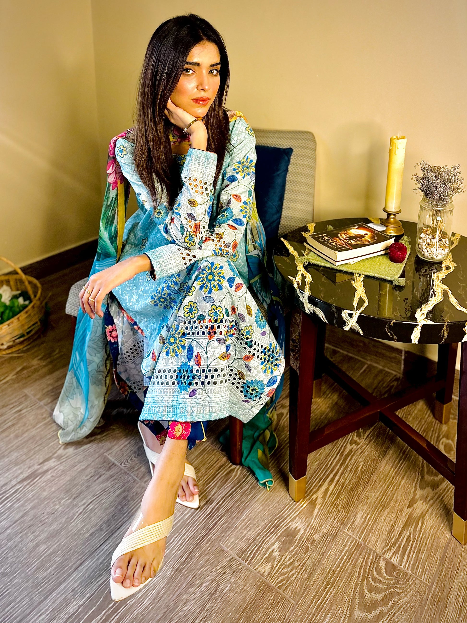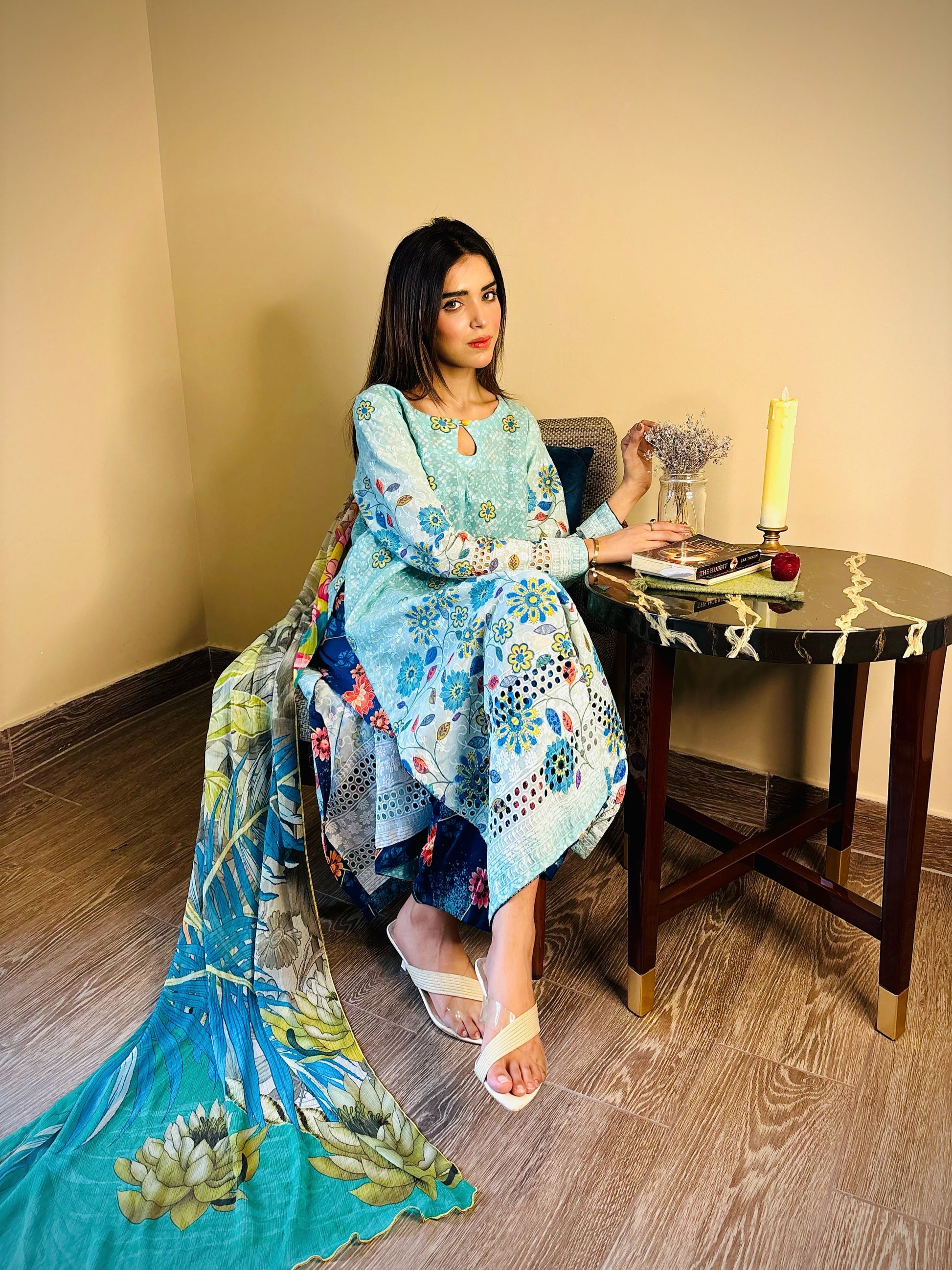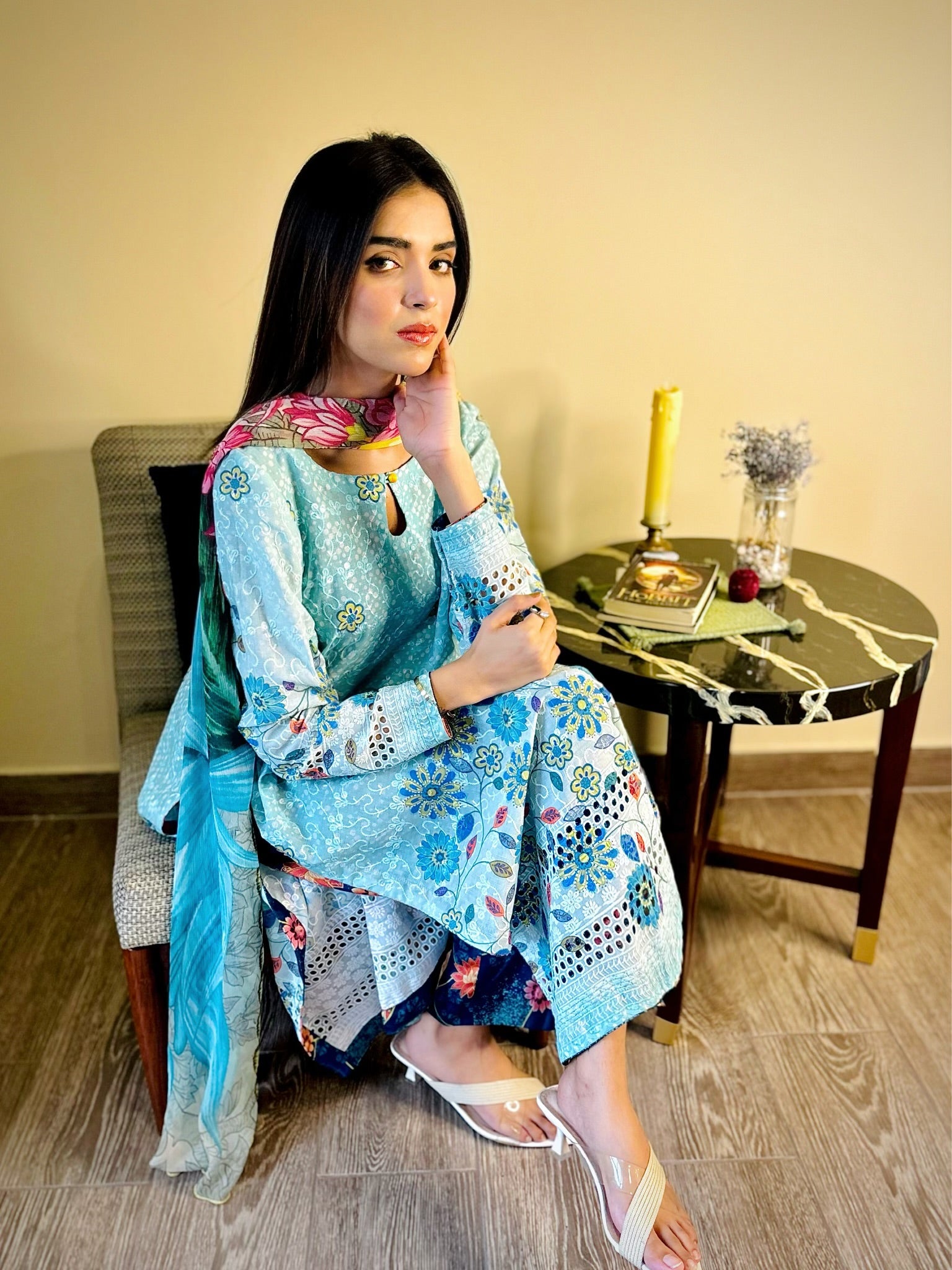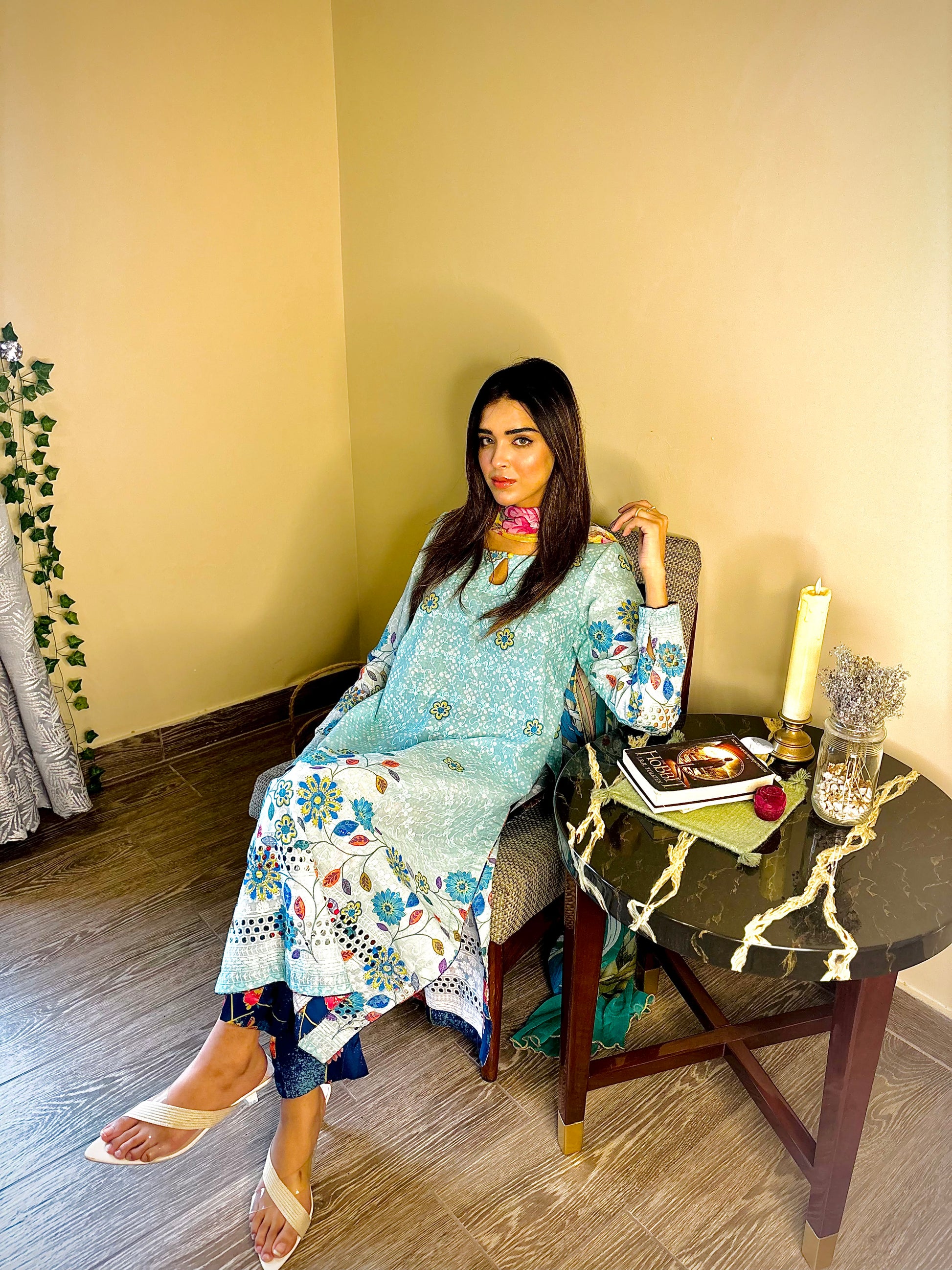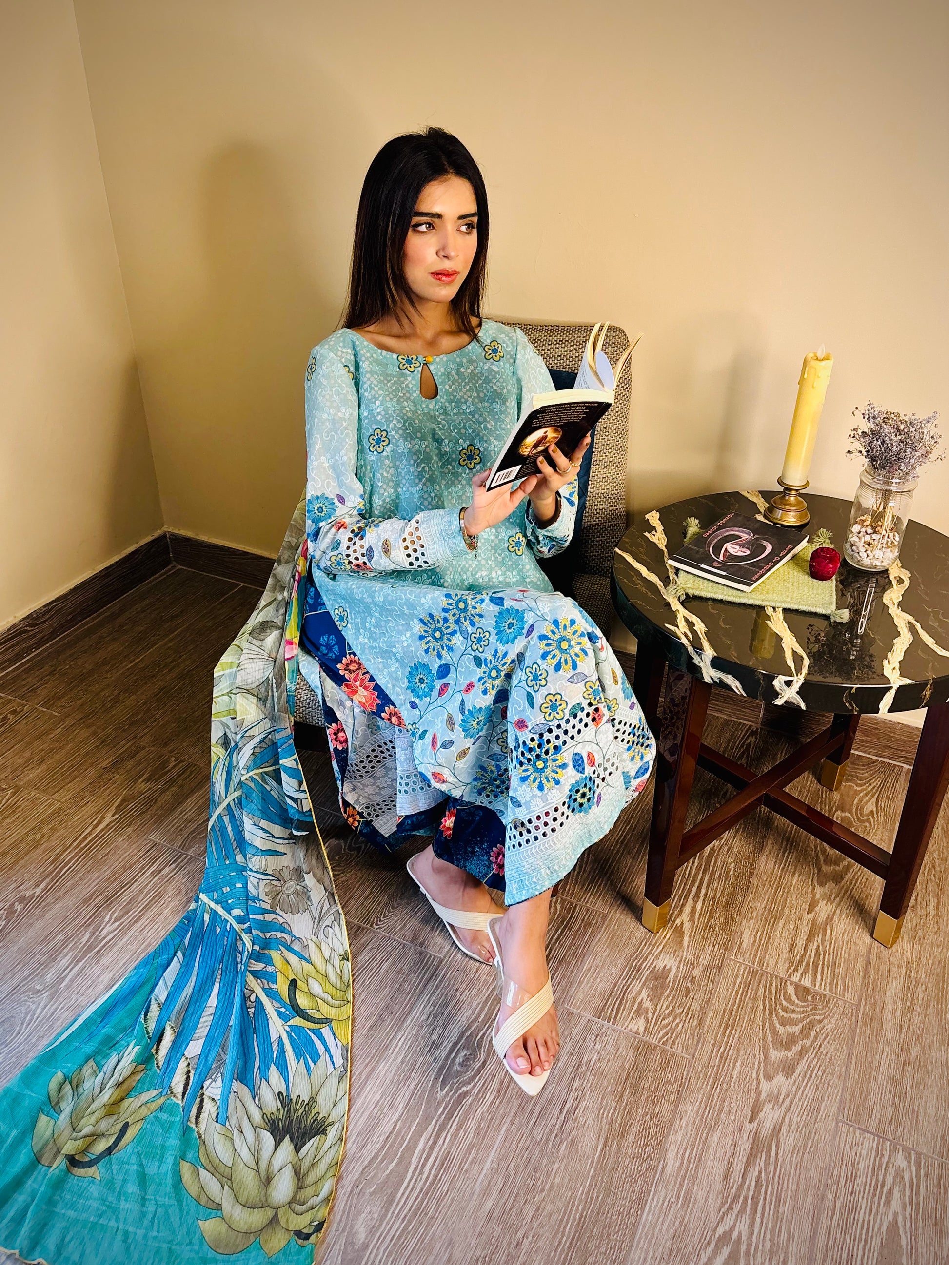 A 2pc paper lawn outfit with light sheen a keyhole neckline & a navy blue printed silk trouser. Some outfits don’t just look good they feel like you! ✨ whether you’re conquering your workday or catching up over coffee.