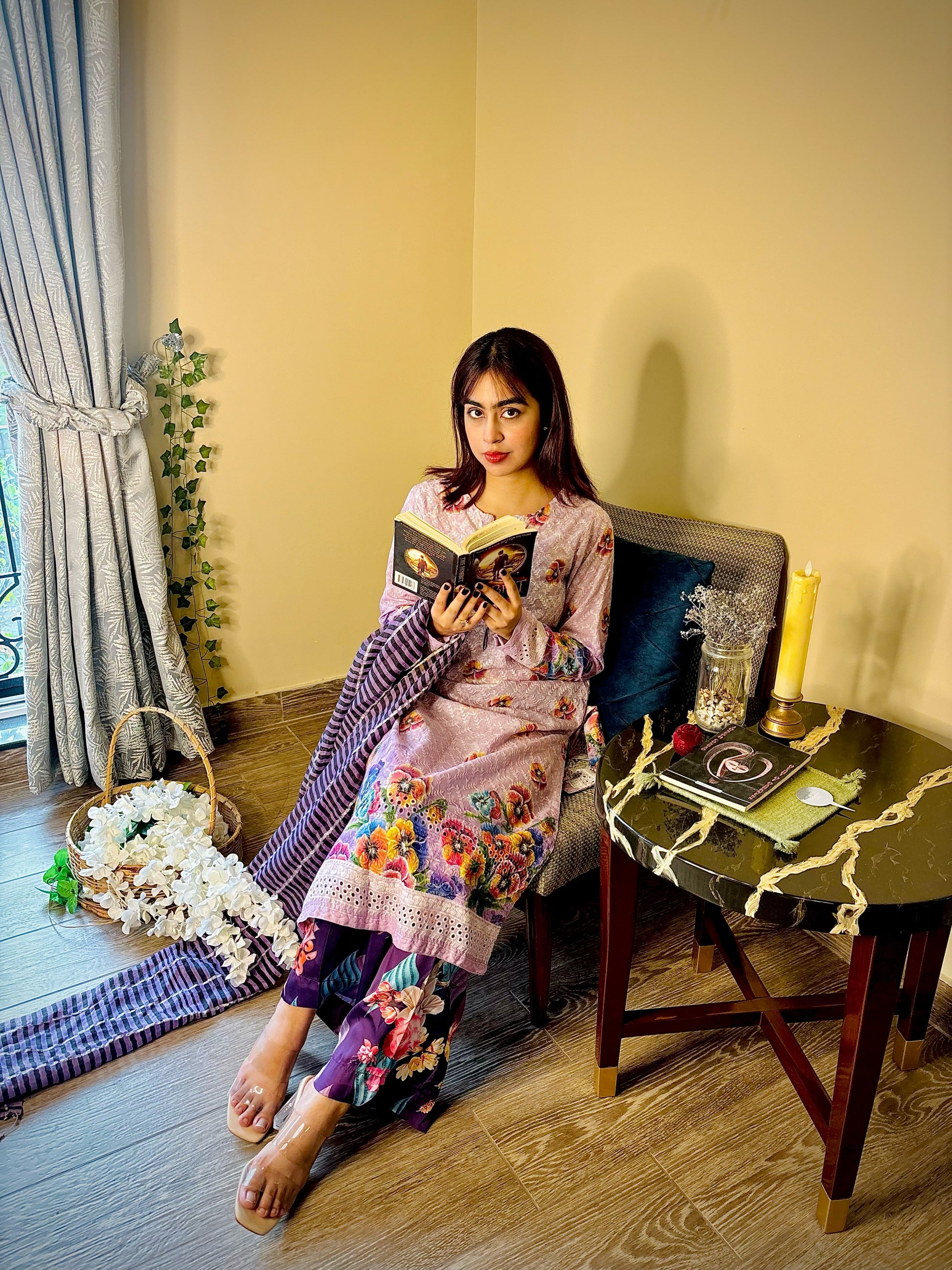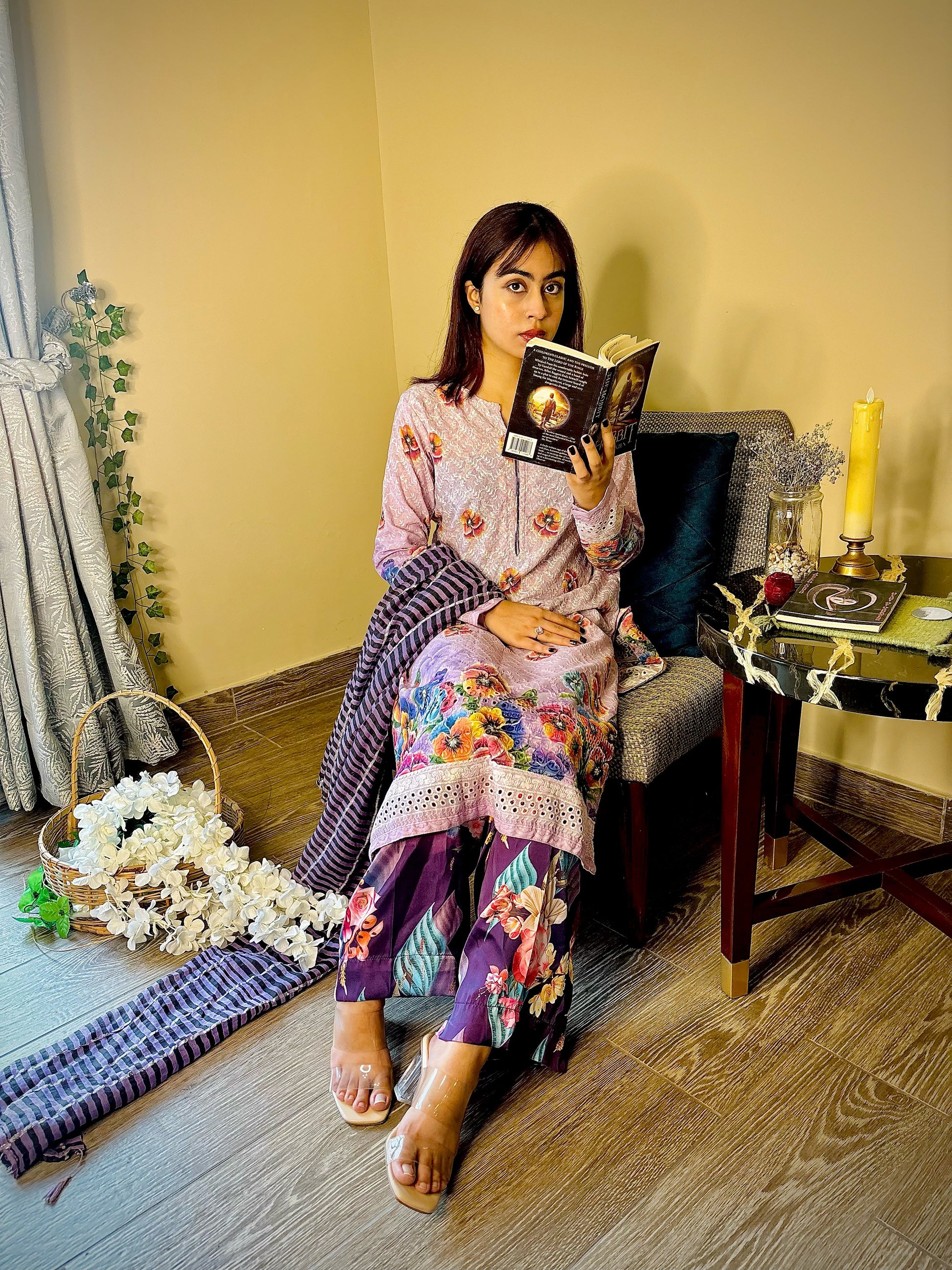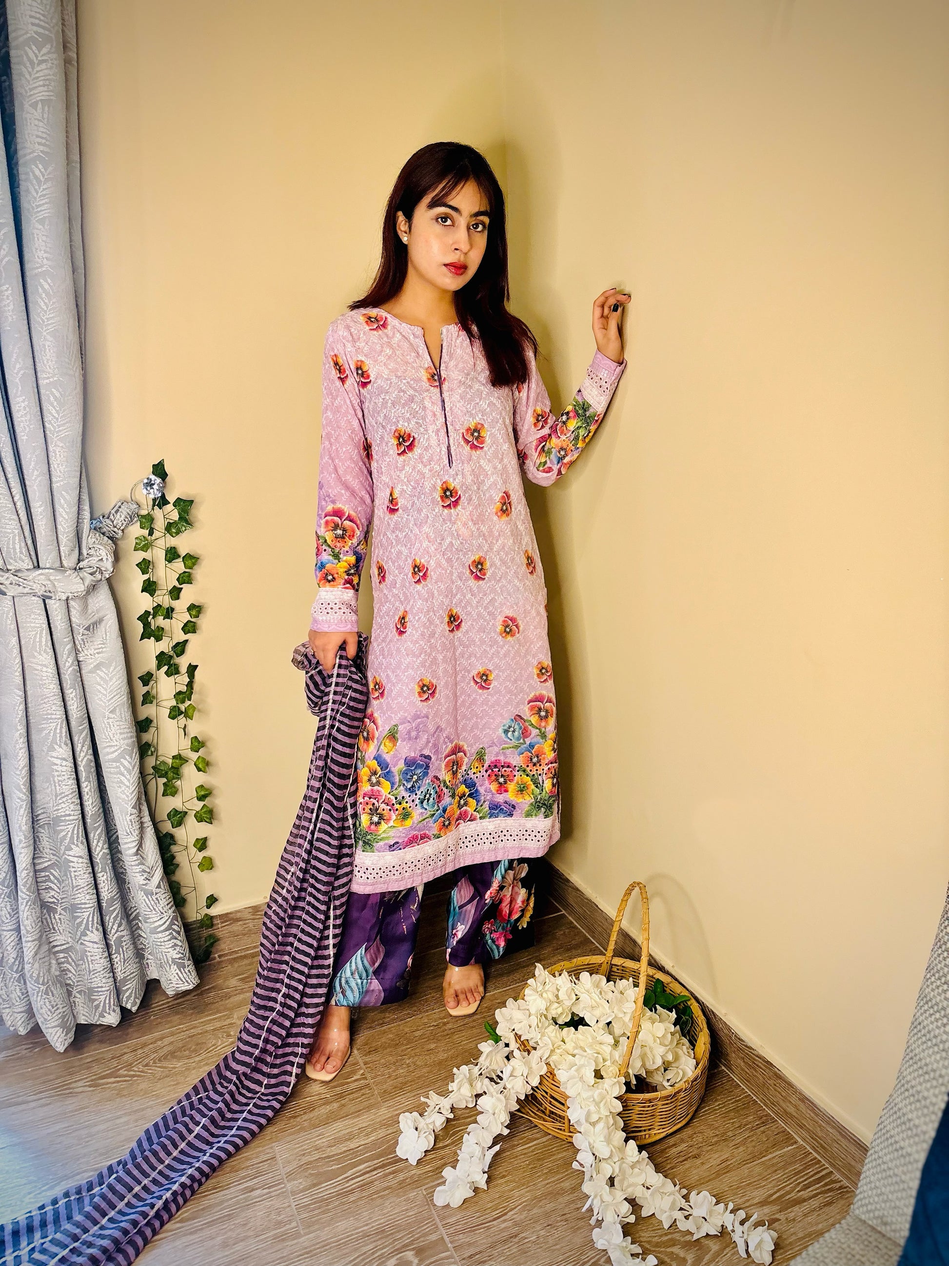A gorgeous 2pc paper lawn outfit with light sheen & floral print paired with silk trousers perfect for everyday wear.