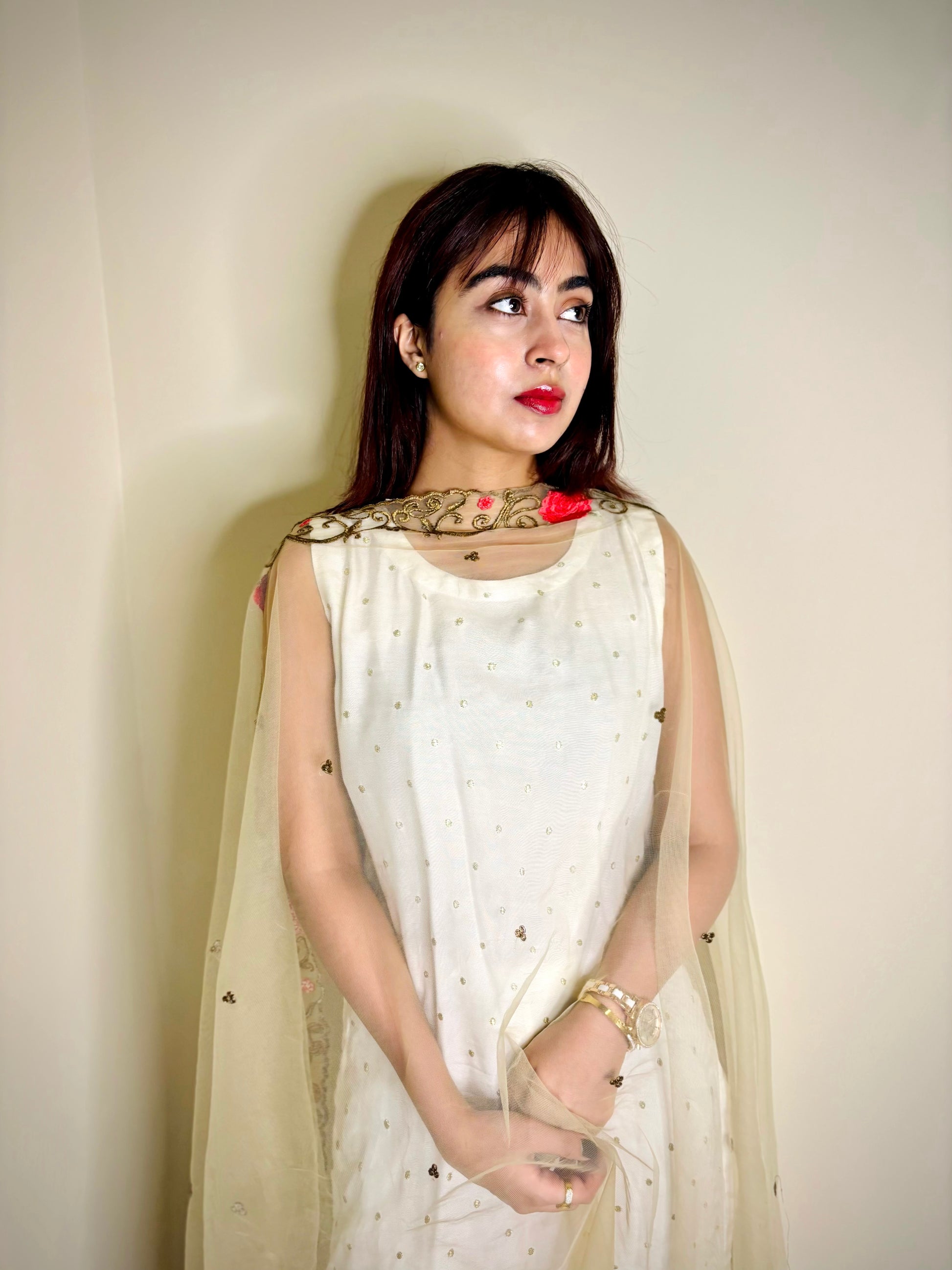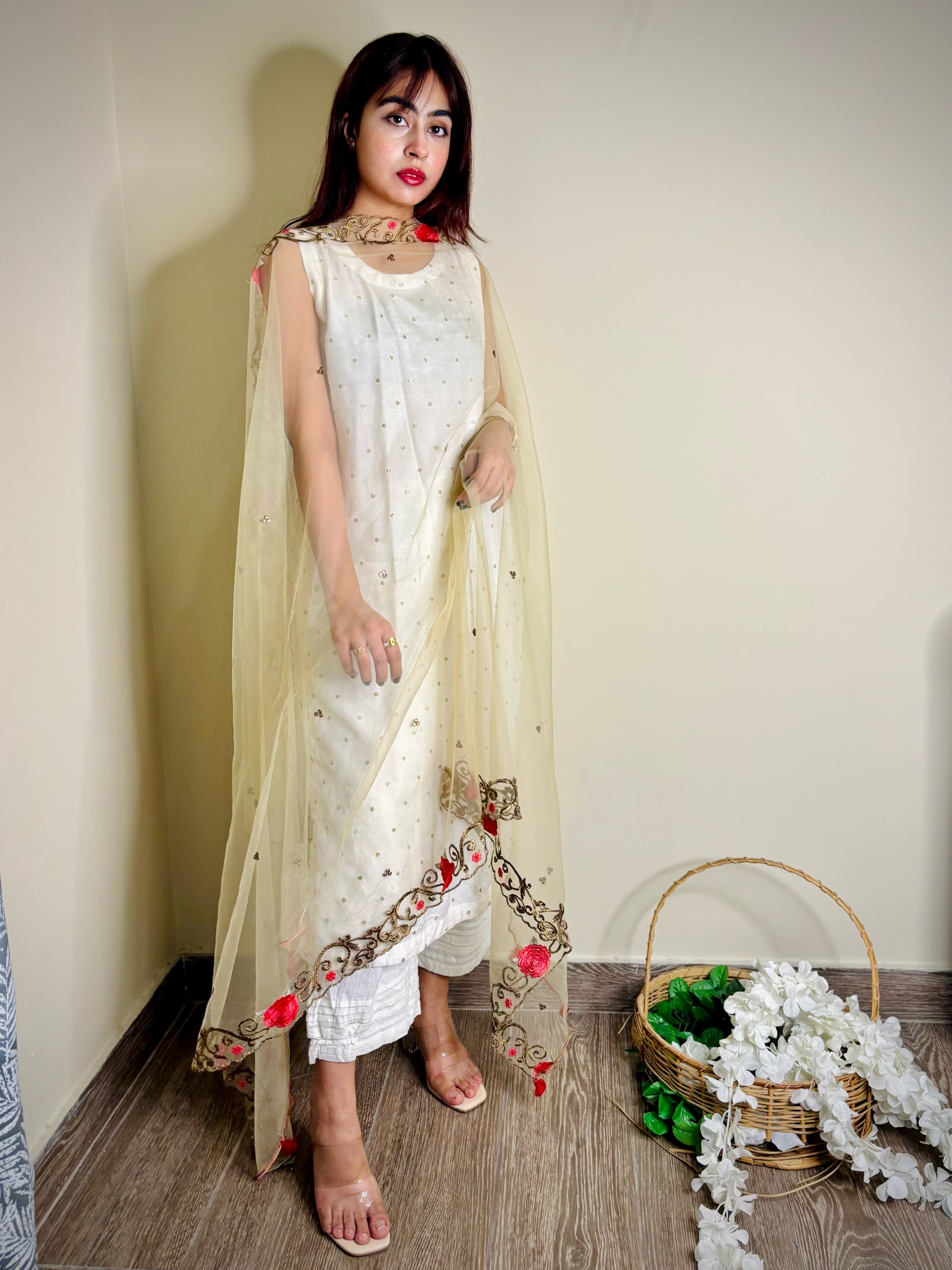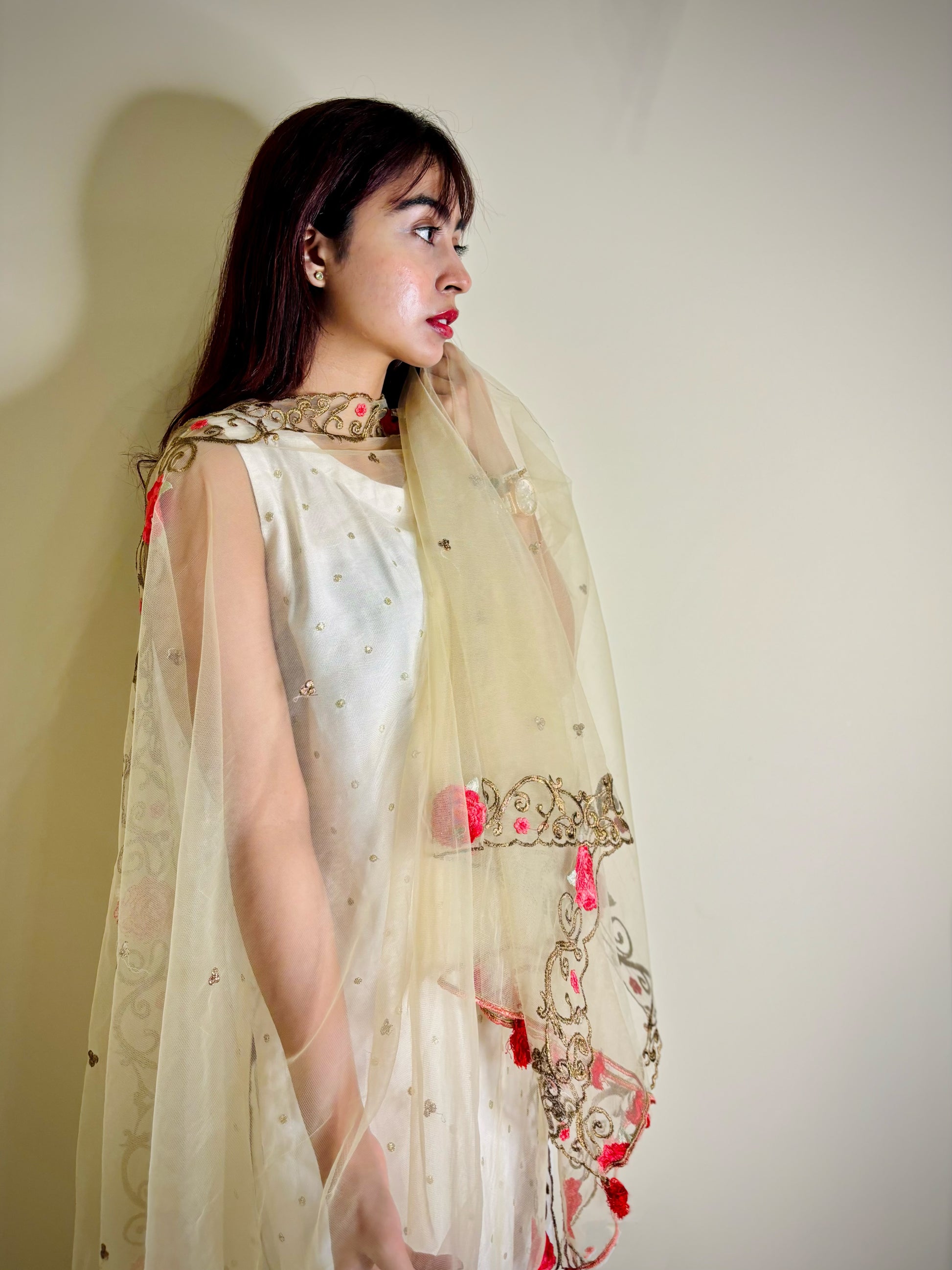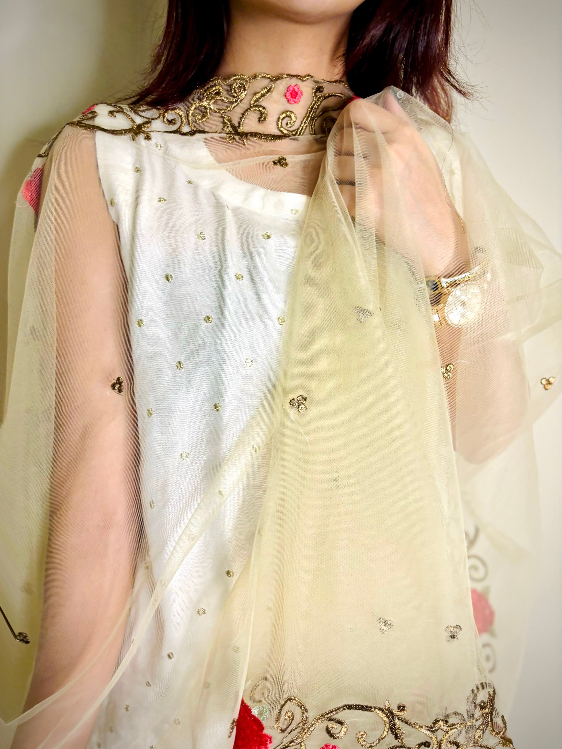 A timeless white Mix Lawn cotton kurta, adorned with delicate gold mirror sequins for a soft, festive shimmer. Paired with a sheer organza dupatta, featuring intricate floral embroidery in deep red and blush tones, accented with antique gold zari vines. The scalloped edges and soft drape complete this look of effortless grace, perfect for Eid, brunches, or day-to-evening wear.