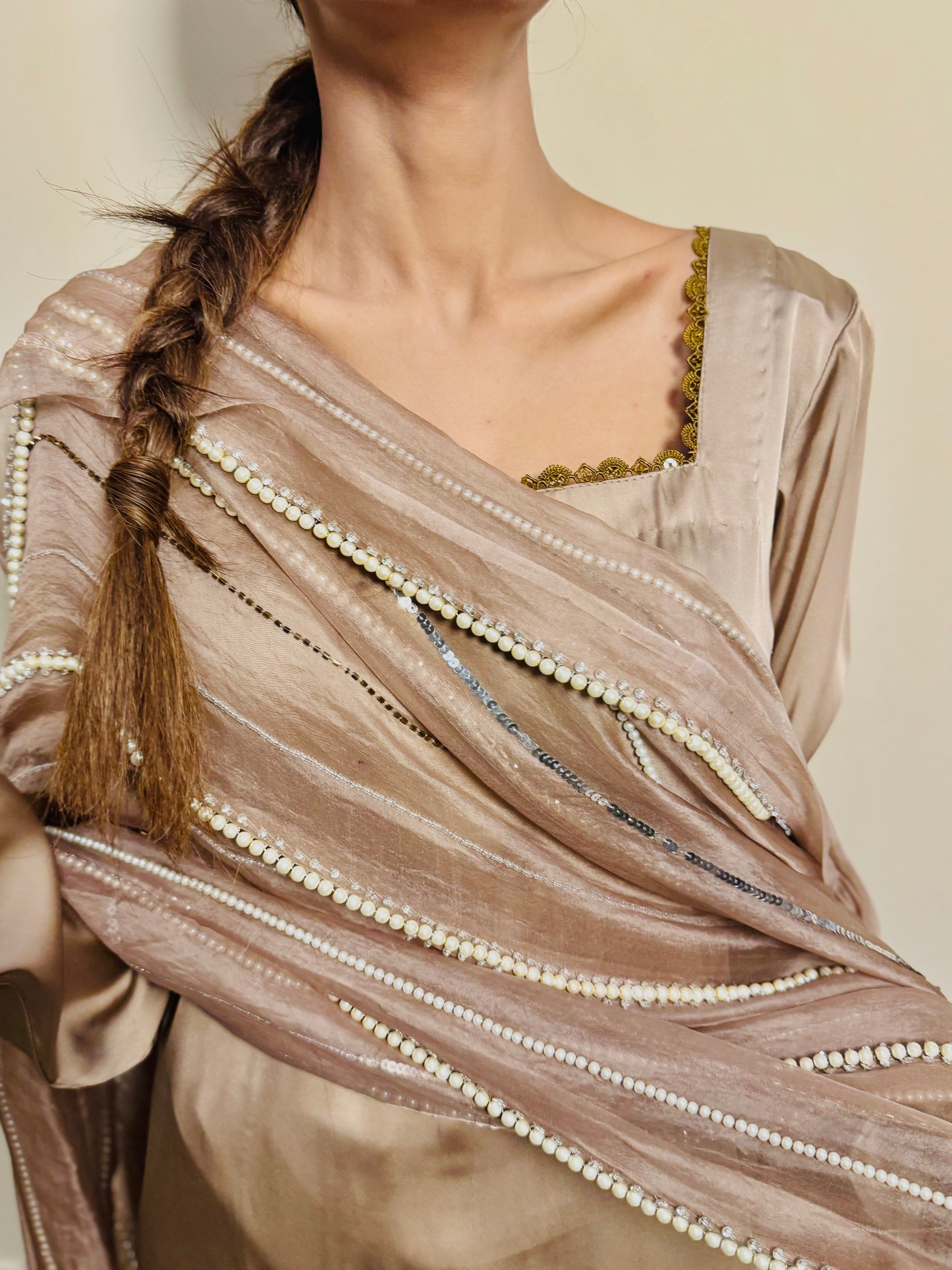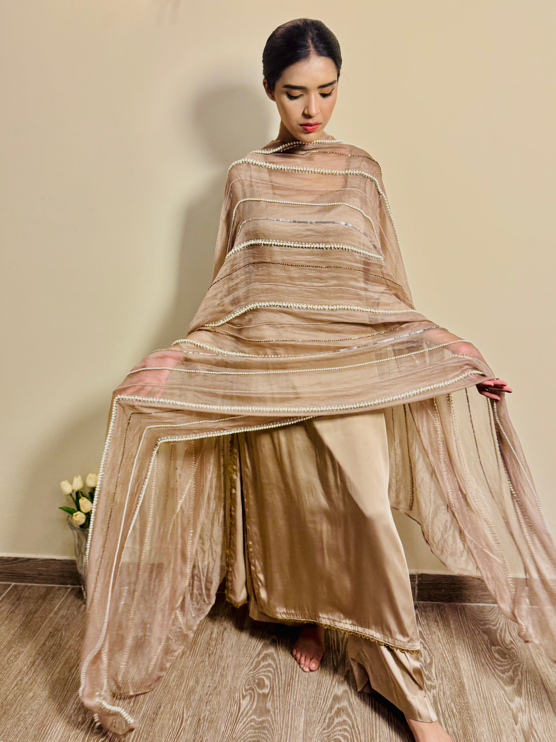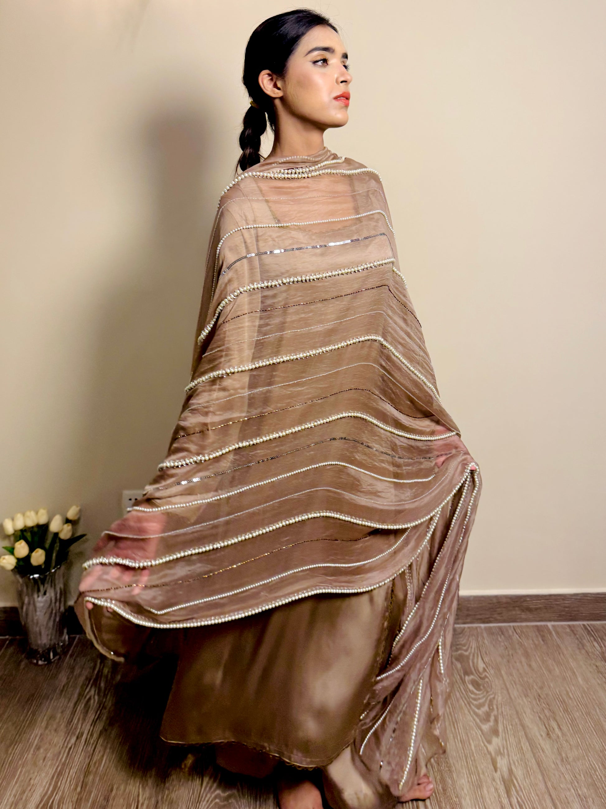 Deep, rich, and effortlessly chic. Our chocolate brown 80g silk ensemble with detailed embellishments is a statement of refined luxury. Perfect for formal occasions.