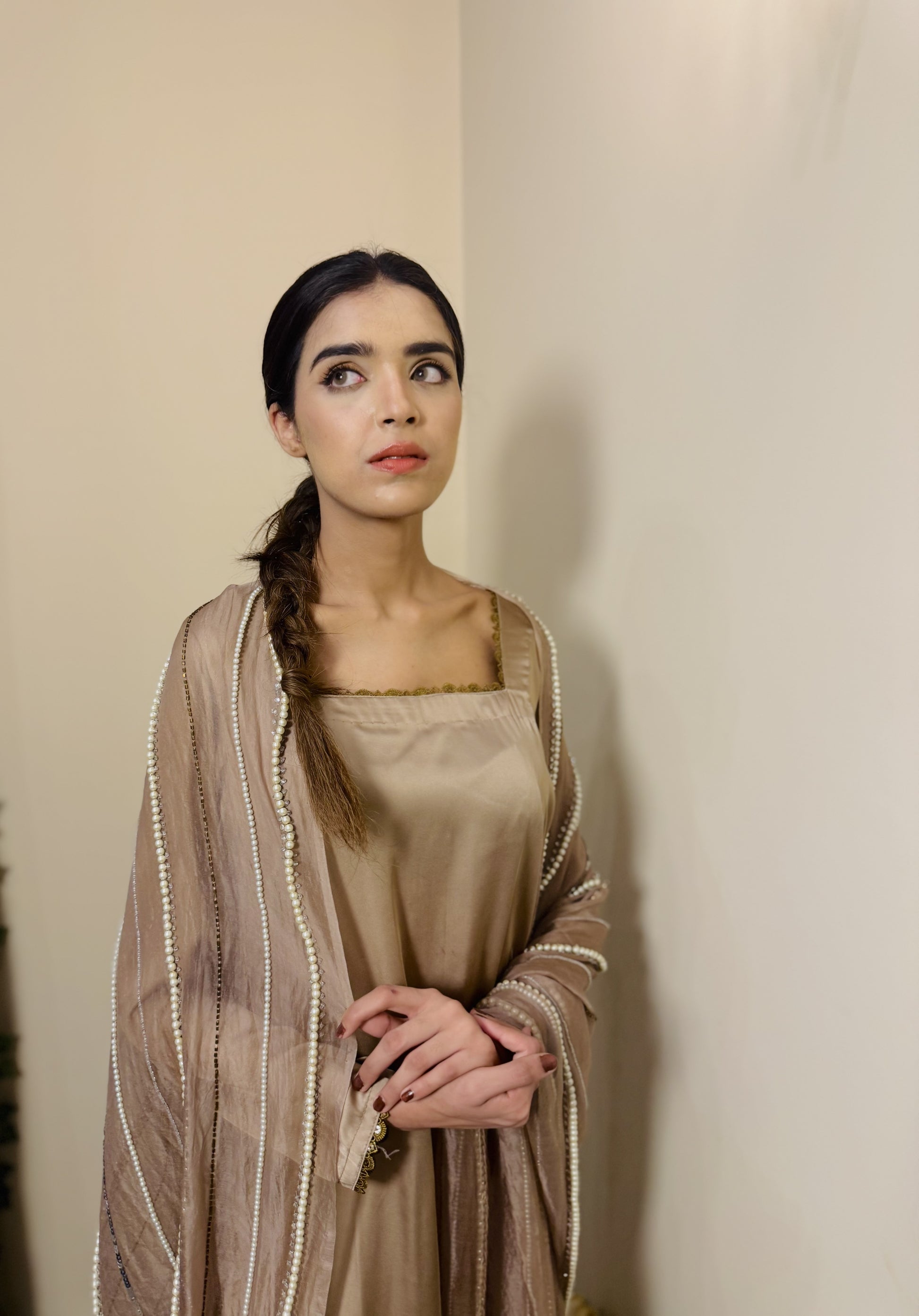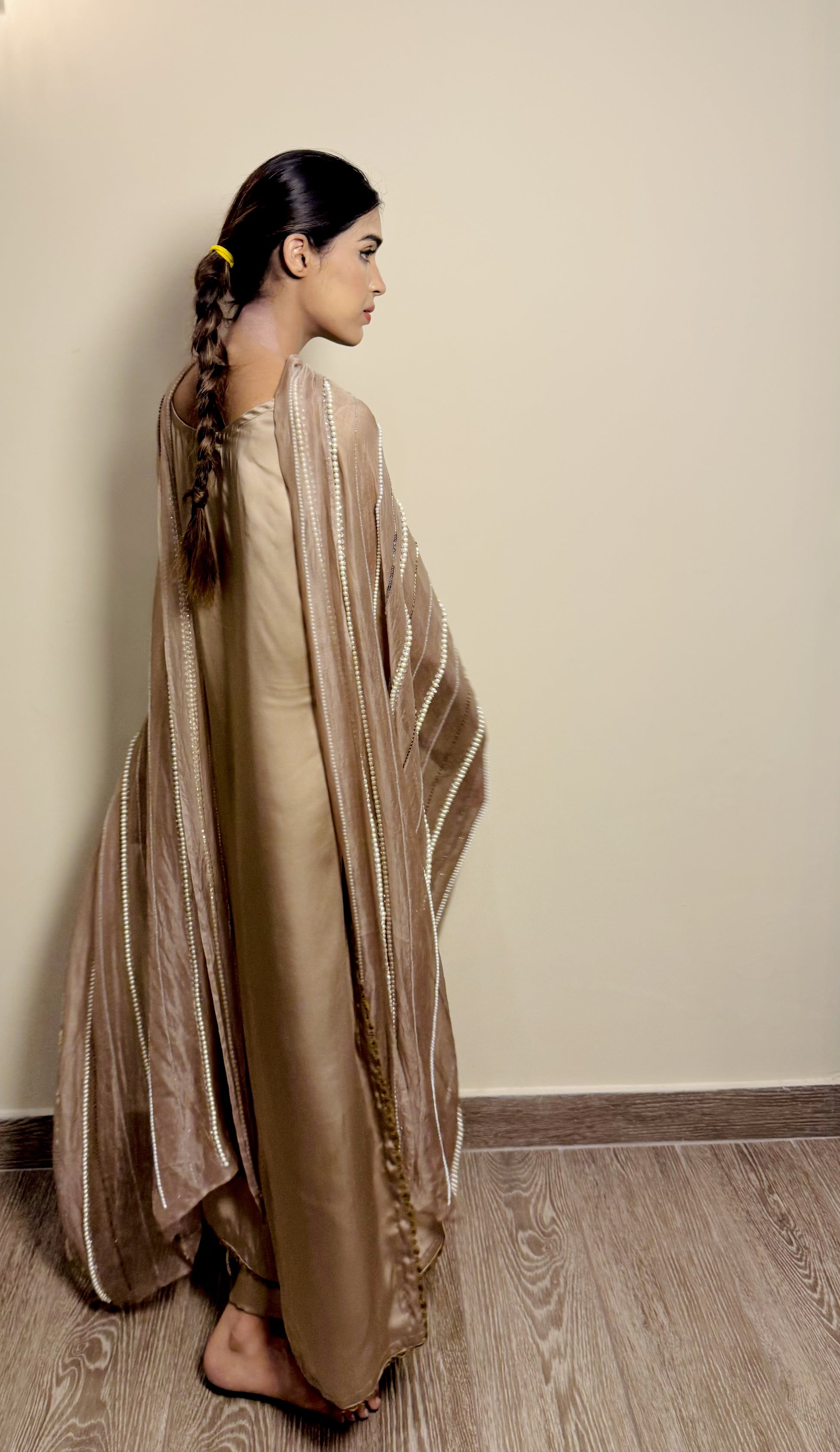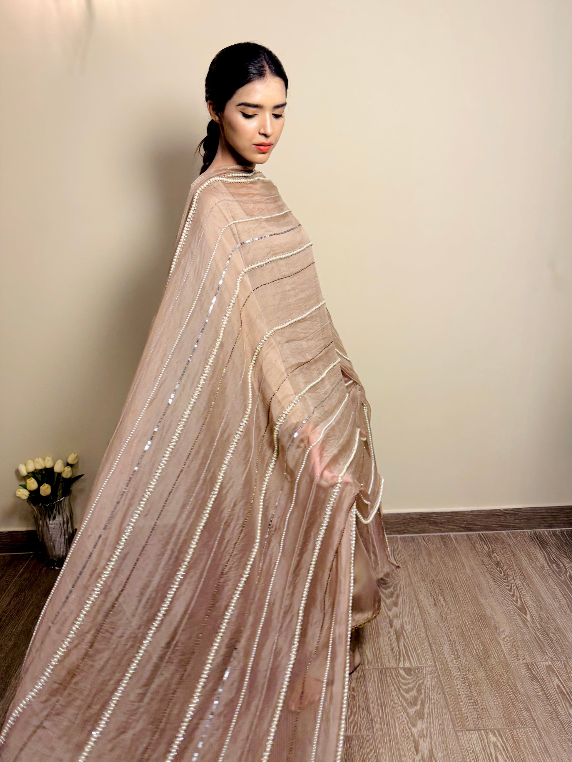 Deep, rich, and effortlessly chic. Our chocolate brown 80g silk ensemble with detailed embellishments is a statement of refined luxury. Perfect for formal occasions.