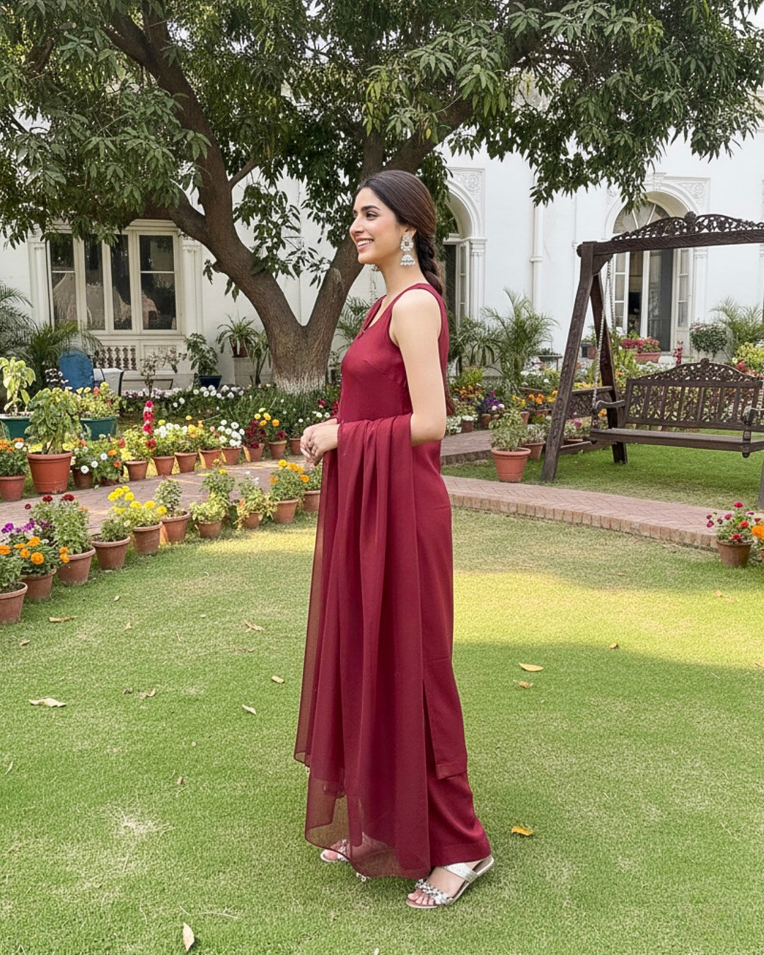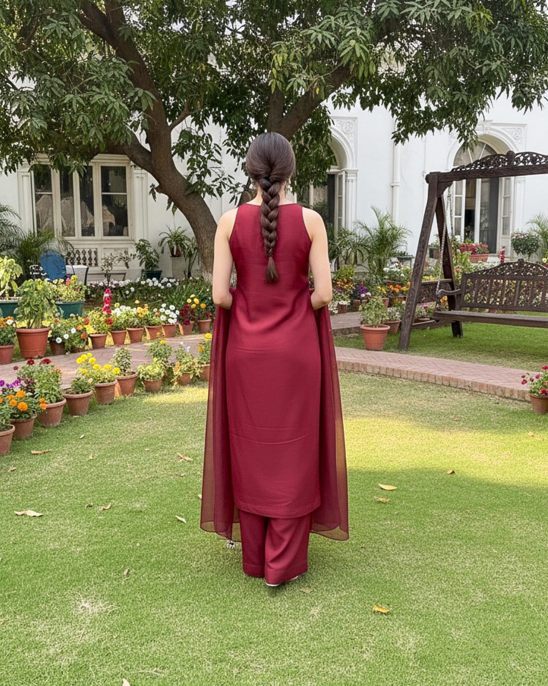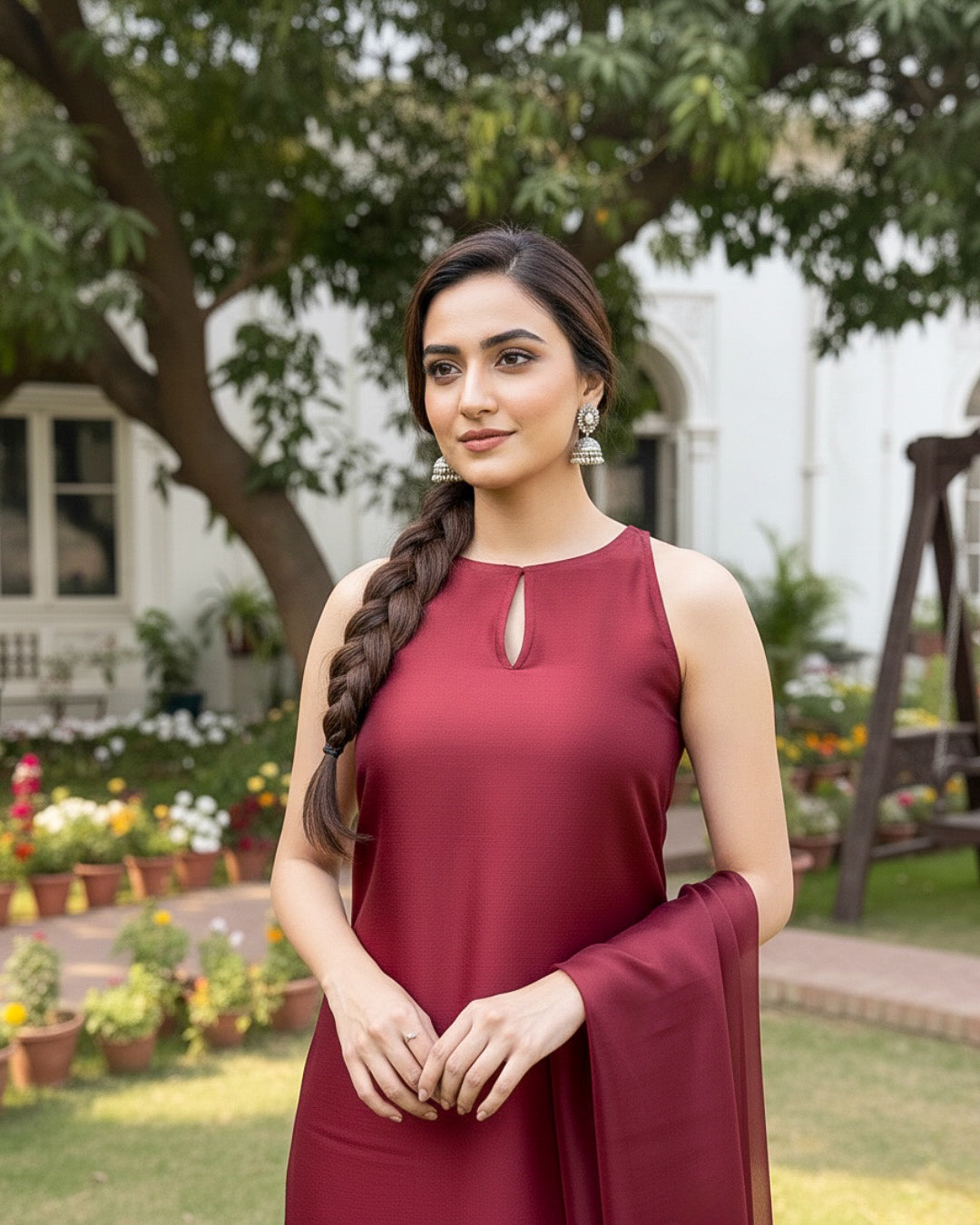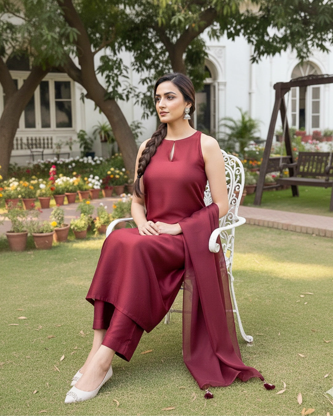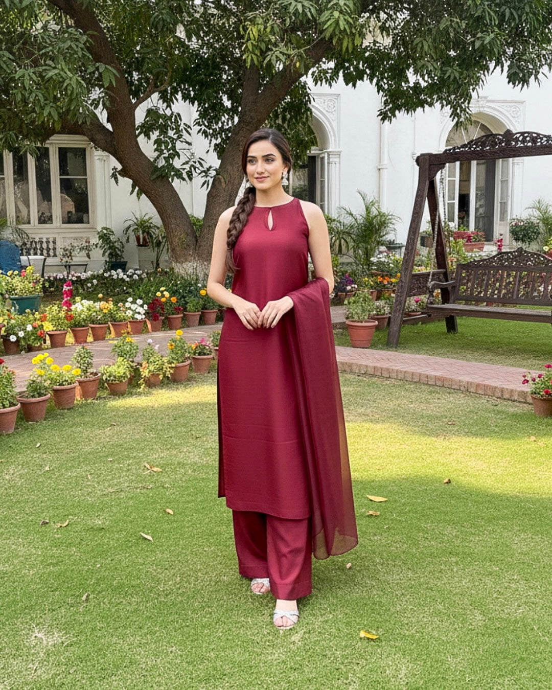 Make an unforgettable statement in this striking Maroon 3-piece set. Crafted from a premium, flowing fabric (like raw silk or georgette), the sleeveless, straight-cut tunic features a modern high-neckline with a delicate keyhole cutout. It's paired with comfortable, wide-leg trousers and a matching sheer dupatta. This is your go-to ensemble for elevated garden parties, evening gatherings, or any occasion that calls for refined, effortless glamour.