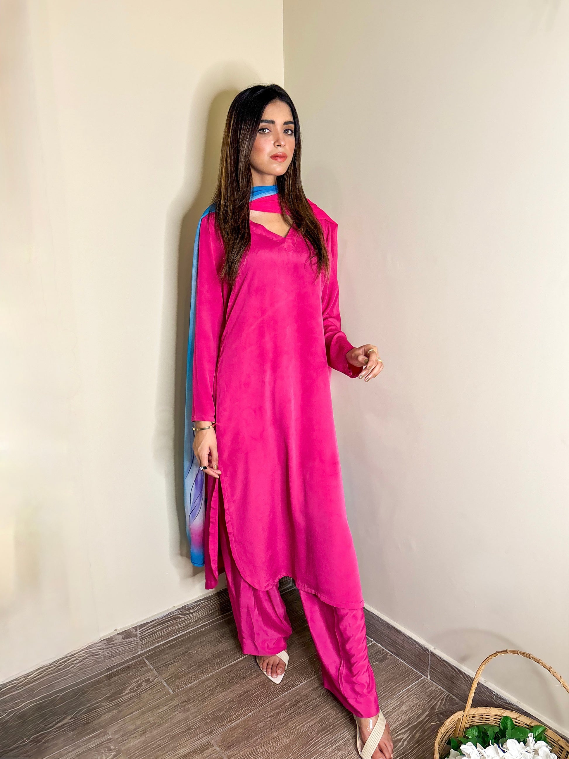 • v neckline & colourful dupatta details for a refined finish without overpowering the solid tone.