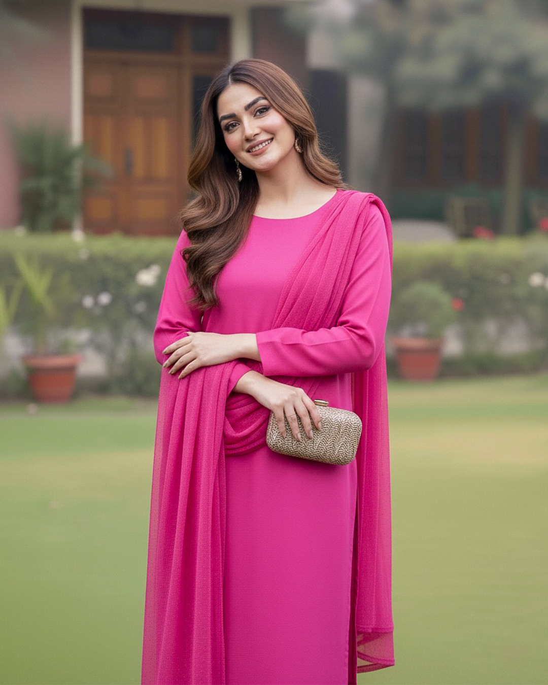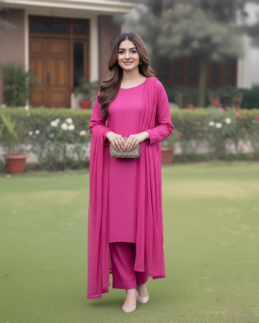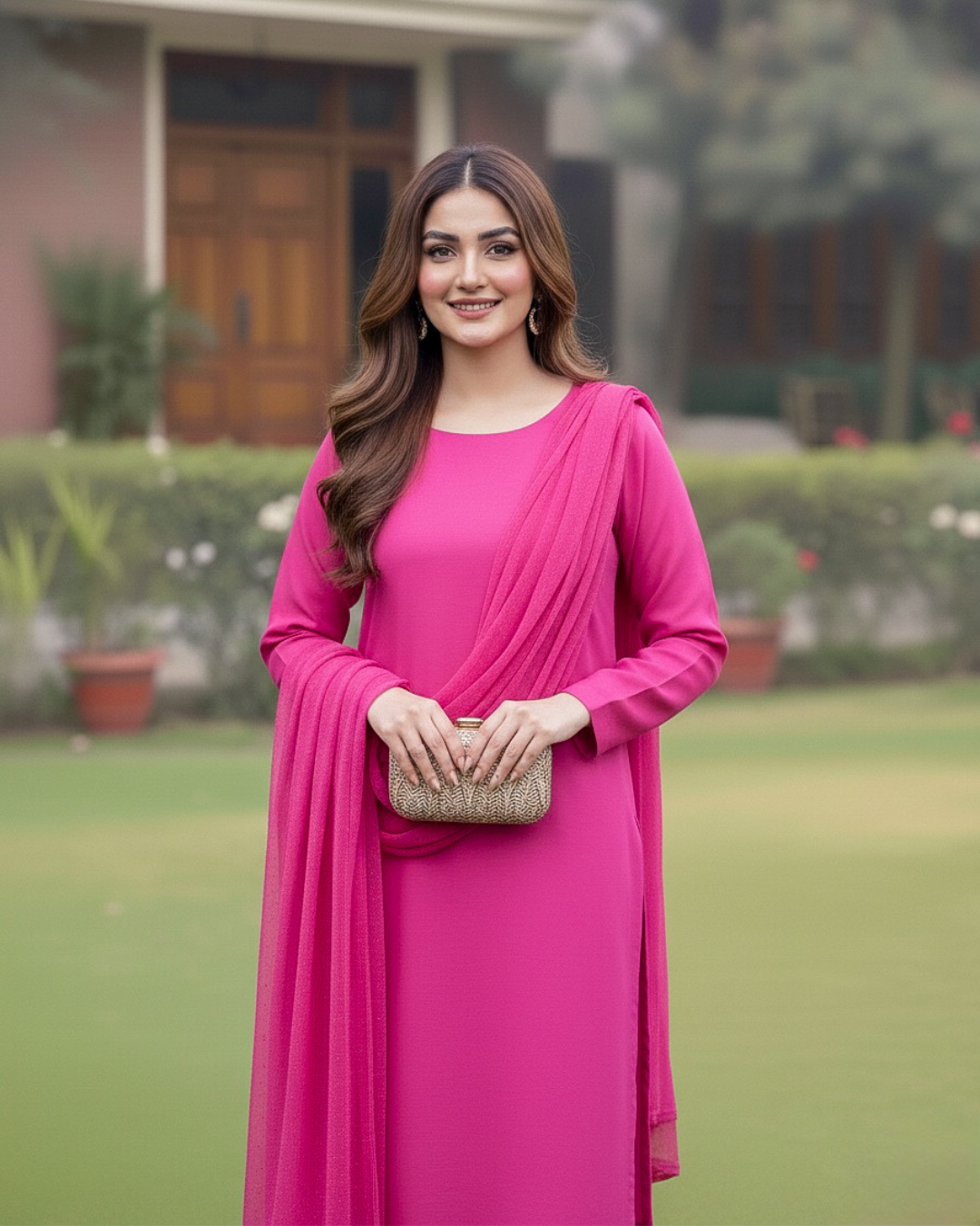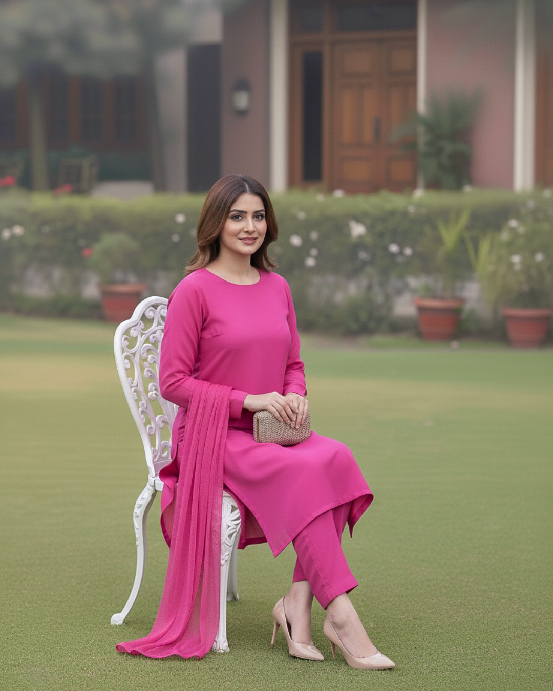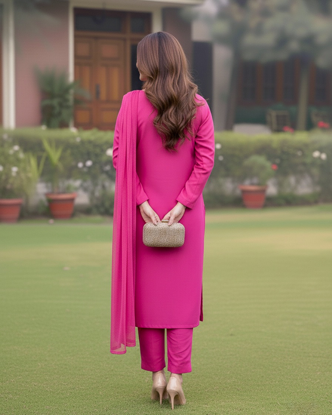 Bring the calm of the sea to your wardrobe with this stunning Hot Pink 3-piece set. This solid suit features a straight-cut, mid-length kameez and tailored straight trousers, crafted from a smooth, premium fabric. Complemented by a matching sheer chiffon dupatta, this elegant and minimal design is perfect for transitioning from office hours to evening gatherings with effortless style.