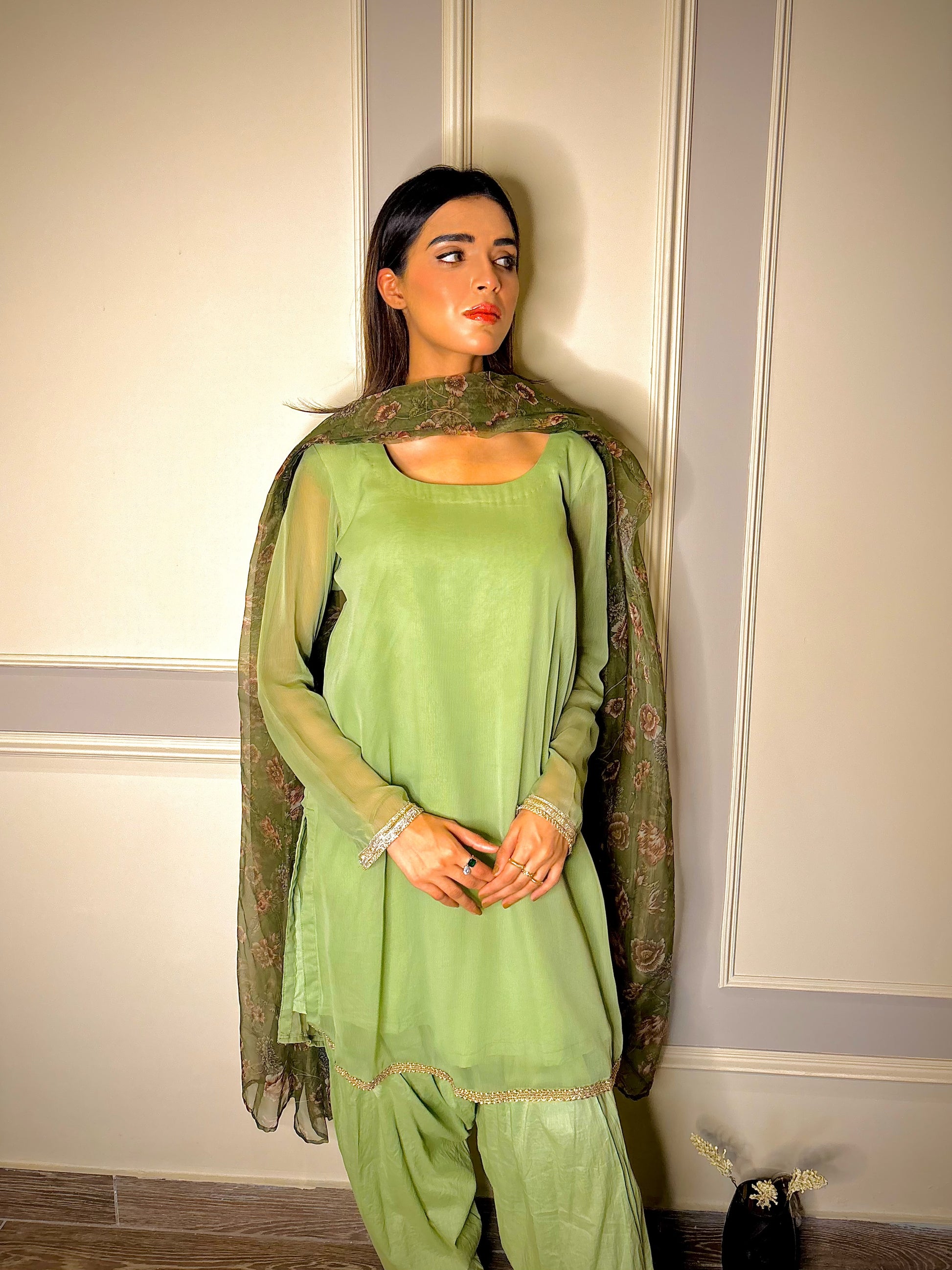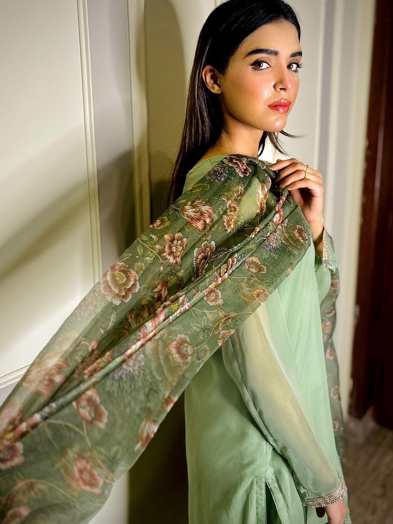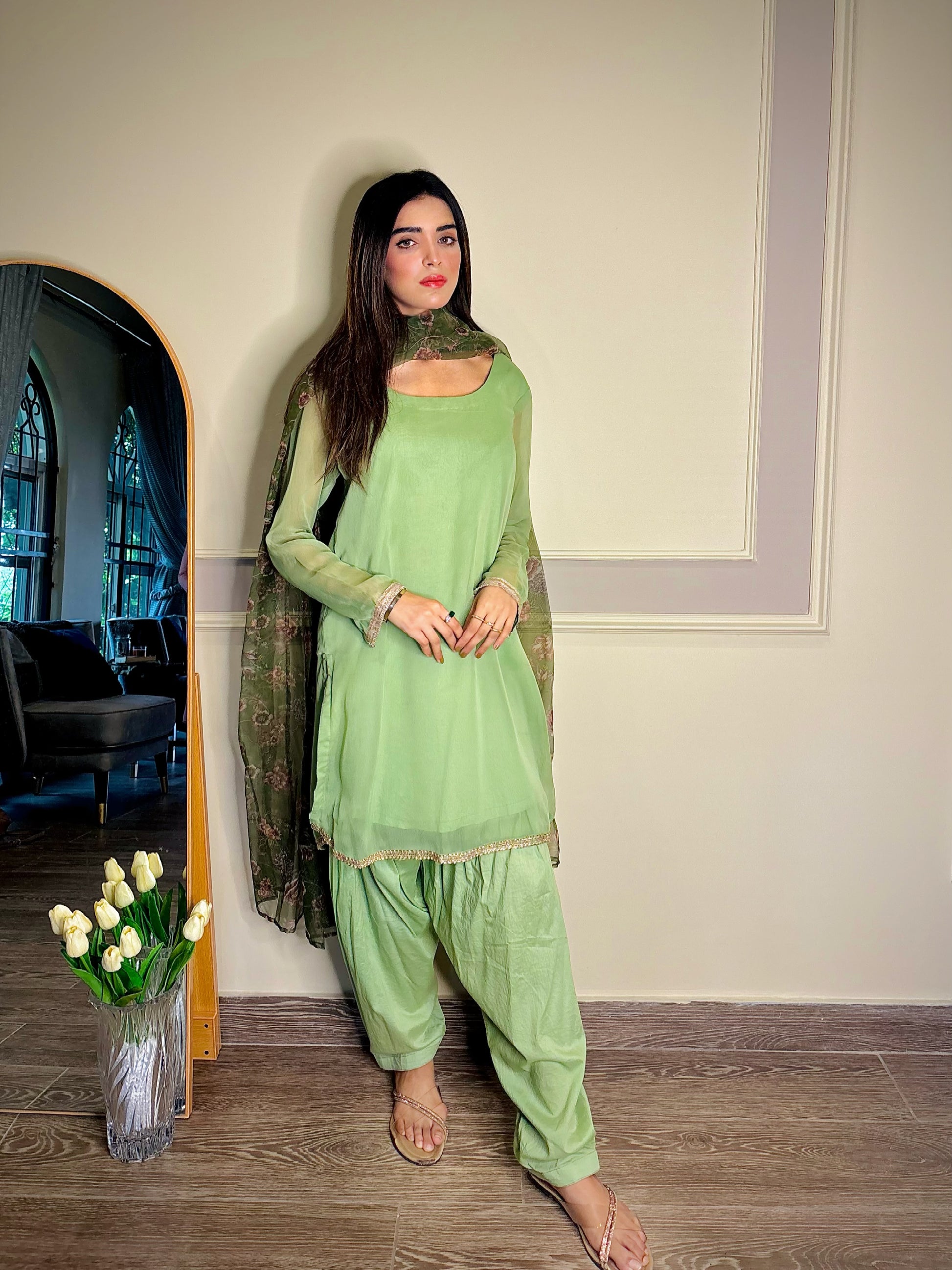A dreamy sage green chiffon shalwar kameez, designed for effortless grace. The flowy silhouette features delicate gotta detailing on the hem and sleeves, paired with a soft lawn shalwar for a traditional yet contemporary look. Finished with a floral embroidered organza dupatta, this ensemble is perfect for summer soirées, brunches, or Eid celebrations.