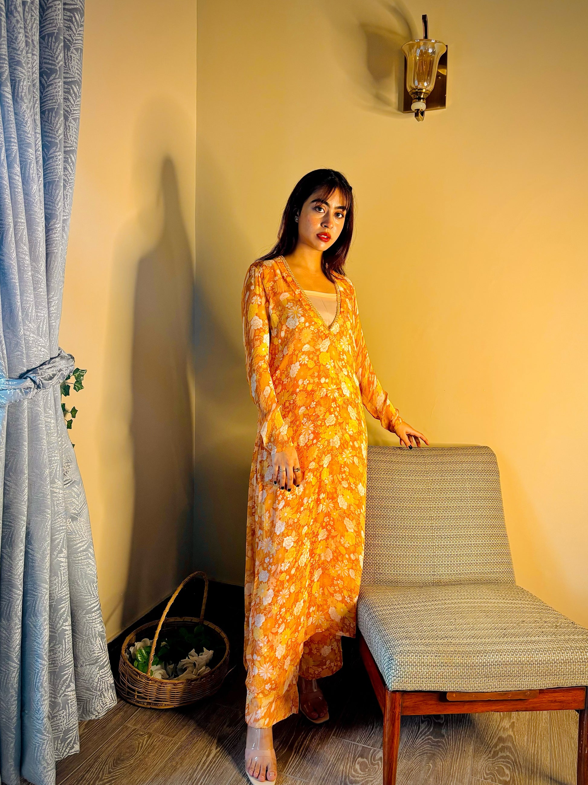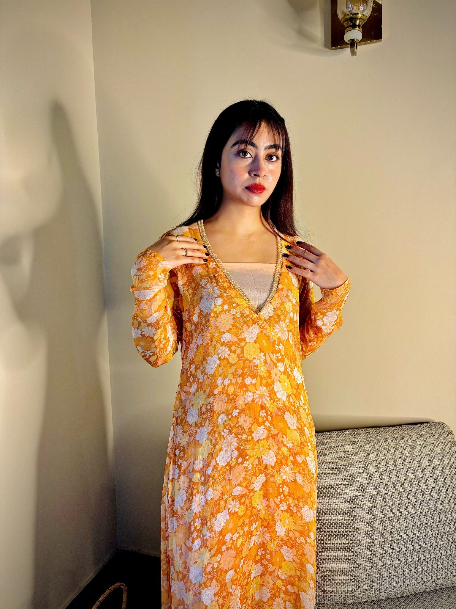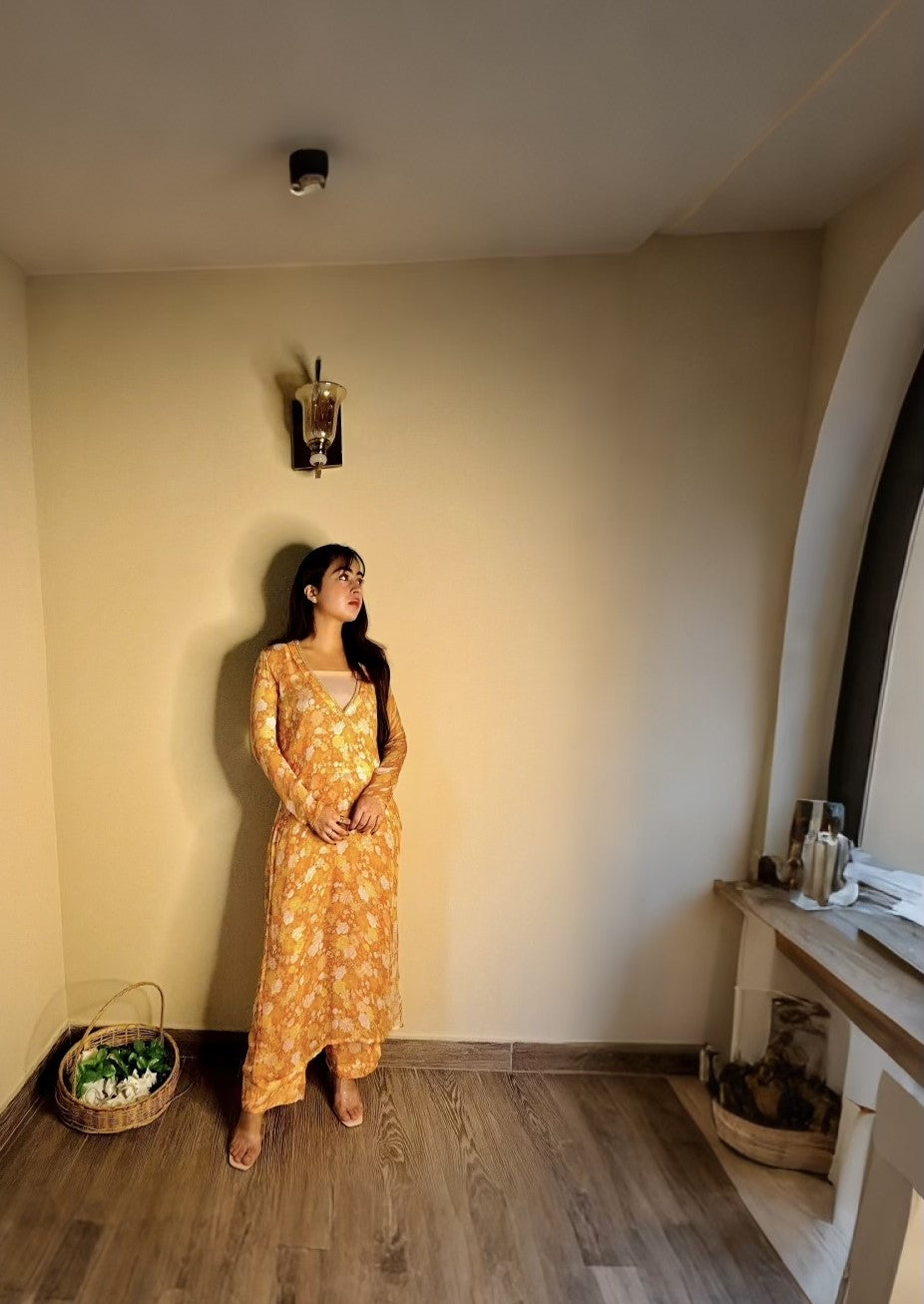 3 pc includes: A slip, loose trouser pants & a long floral shirt beautifully done on Printed Chiffon fabric with long fitted sleeves and a lace on a V neckline. A perfect, easy Breezy summer-friendly Lunch Outfit goals.