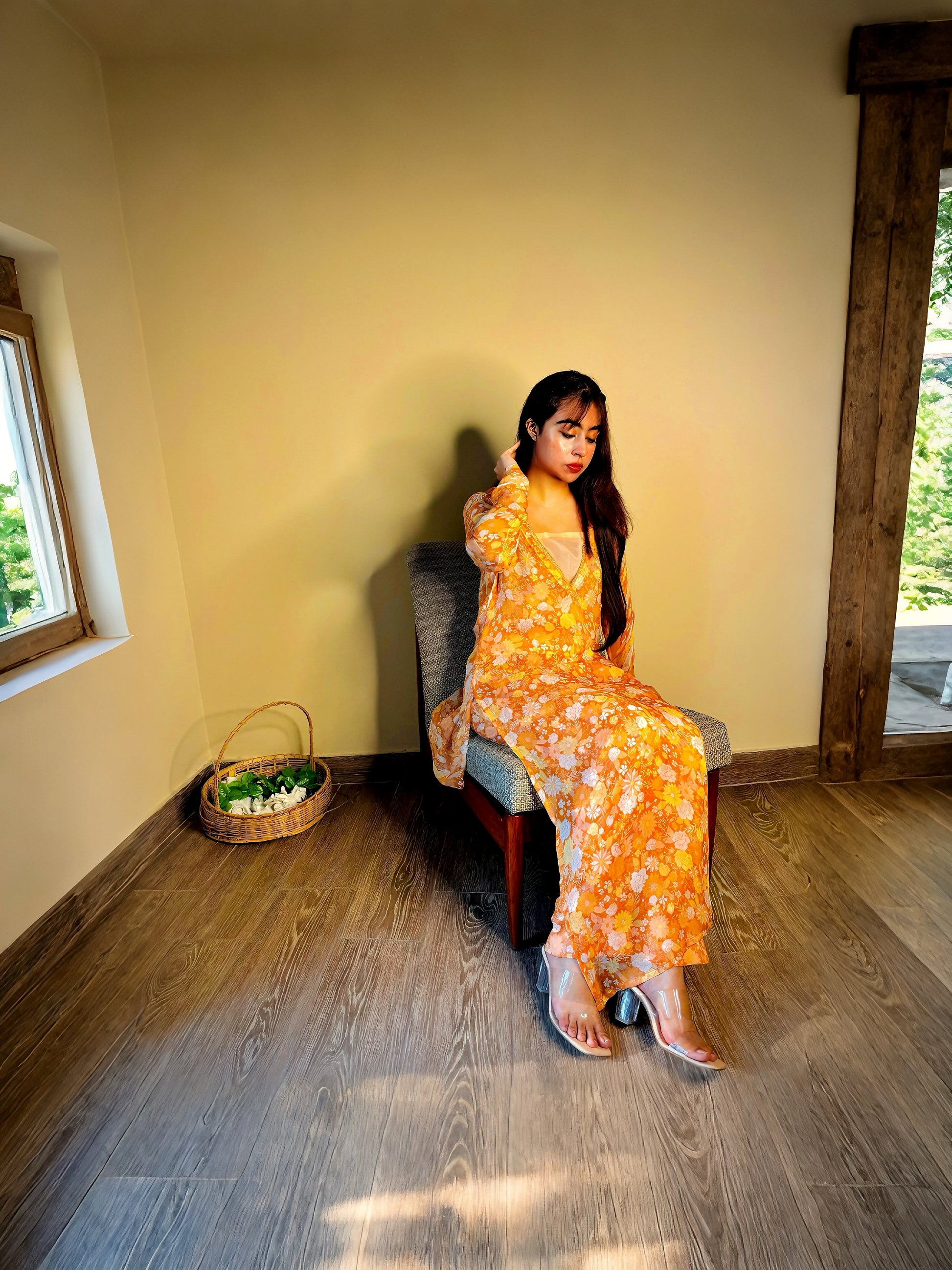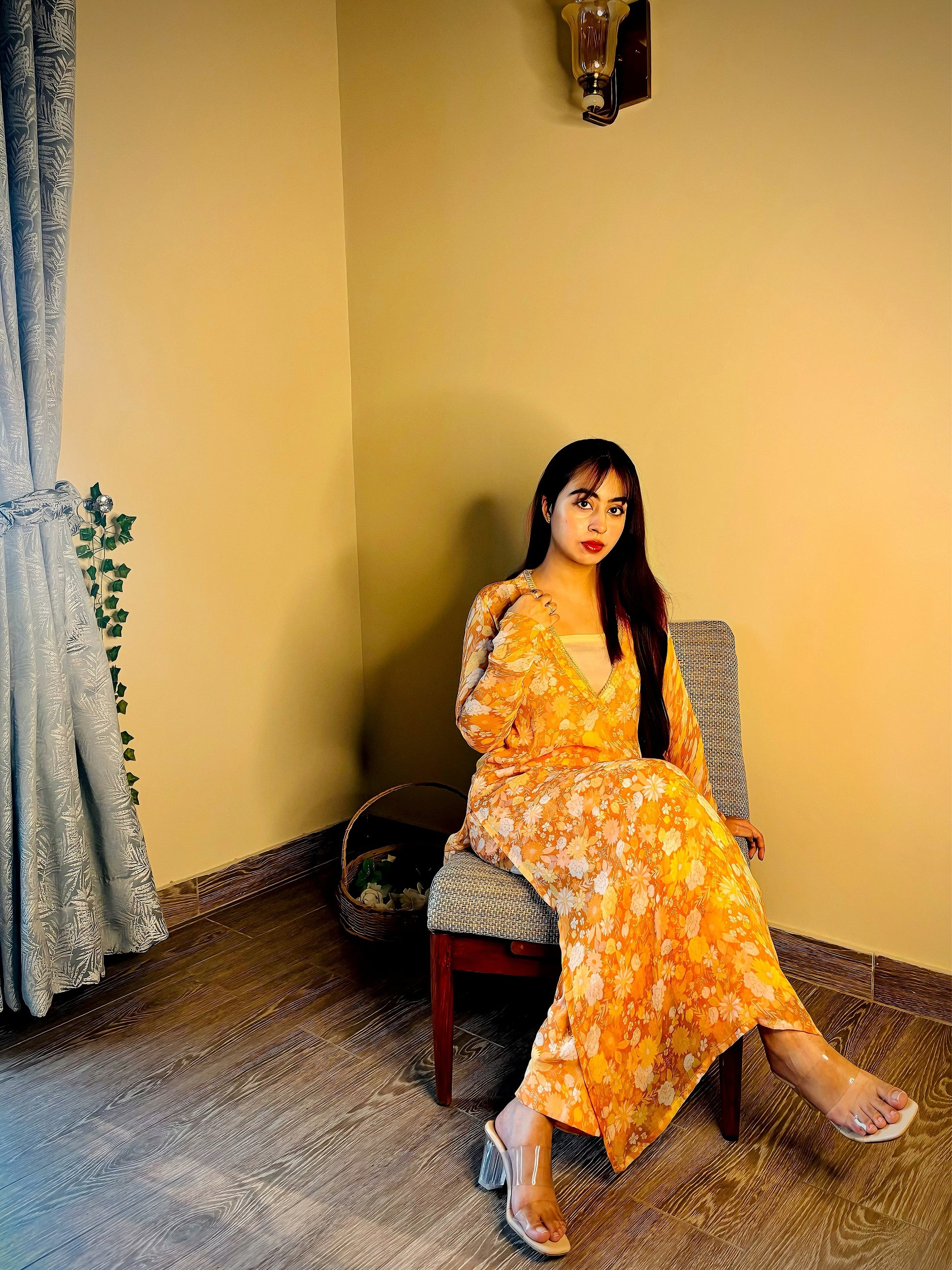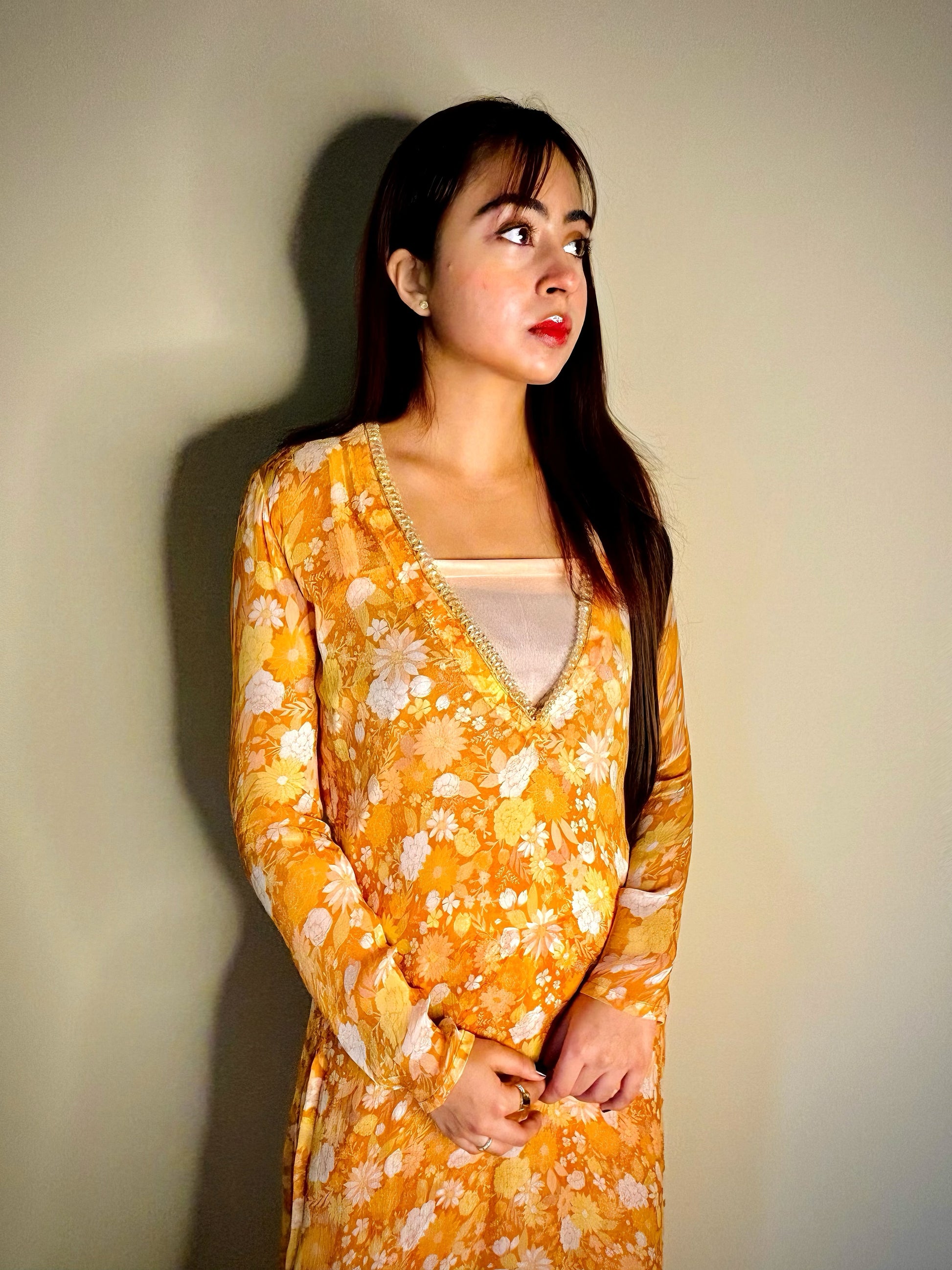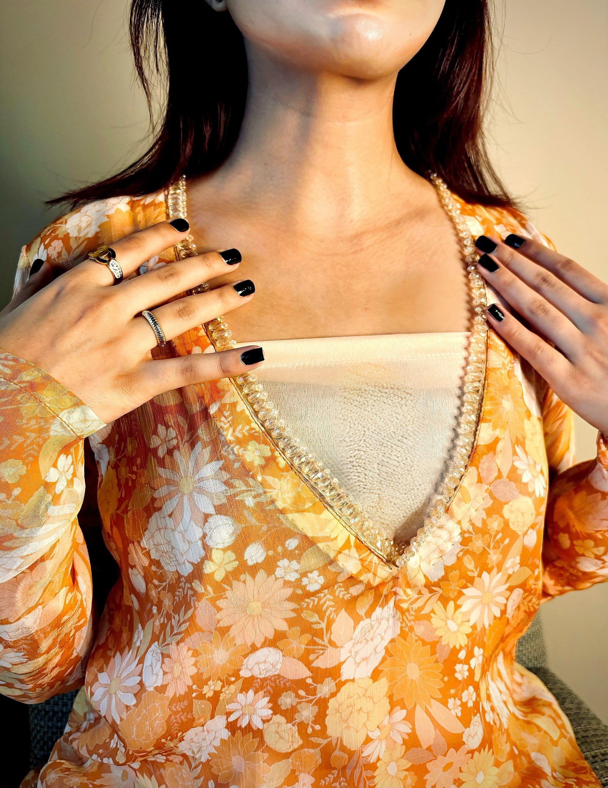 3 pc includes: A slip, loose trouser pants & a long floral shirt beautifully done on Printed Chiffon fabric with long fitted sleeves and a lace on a V neckline. A perfect, easy Breezy summer-friendly Lunch Outfit goals.