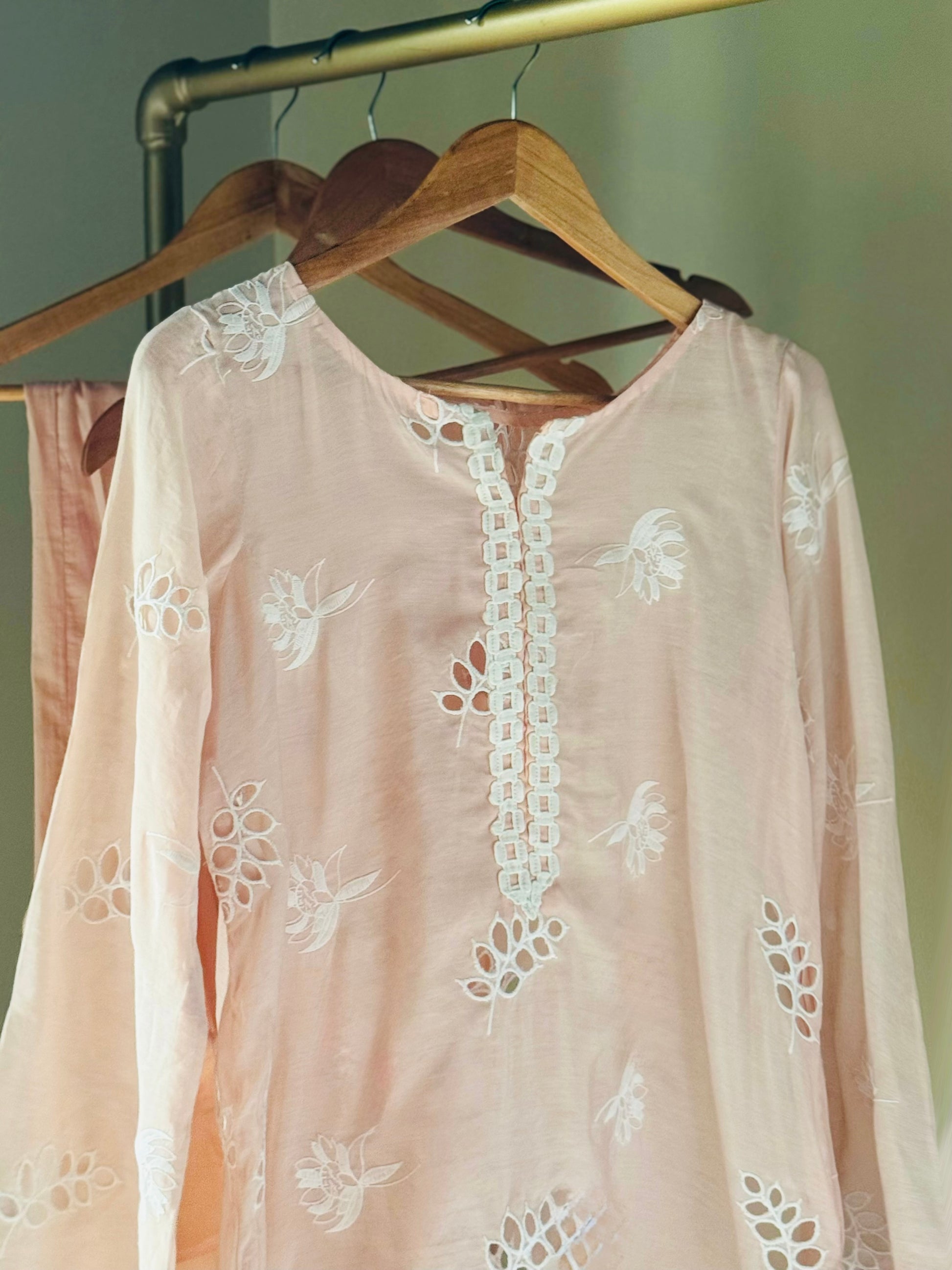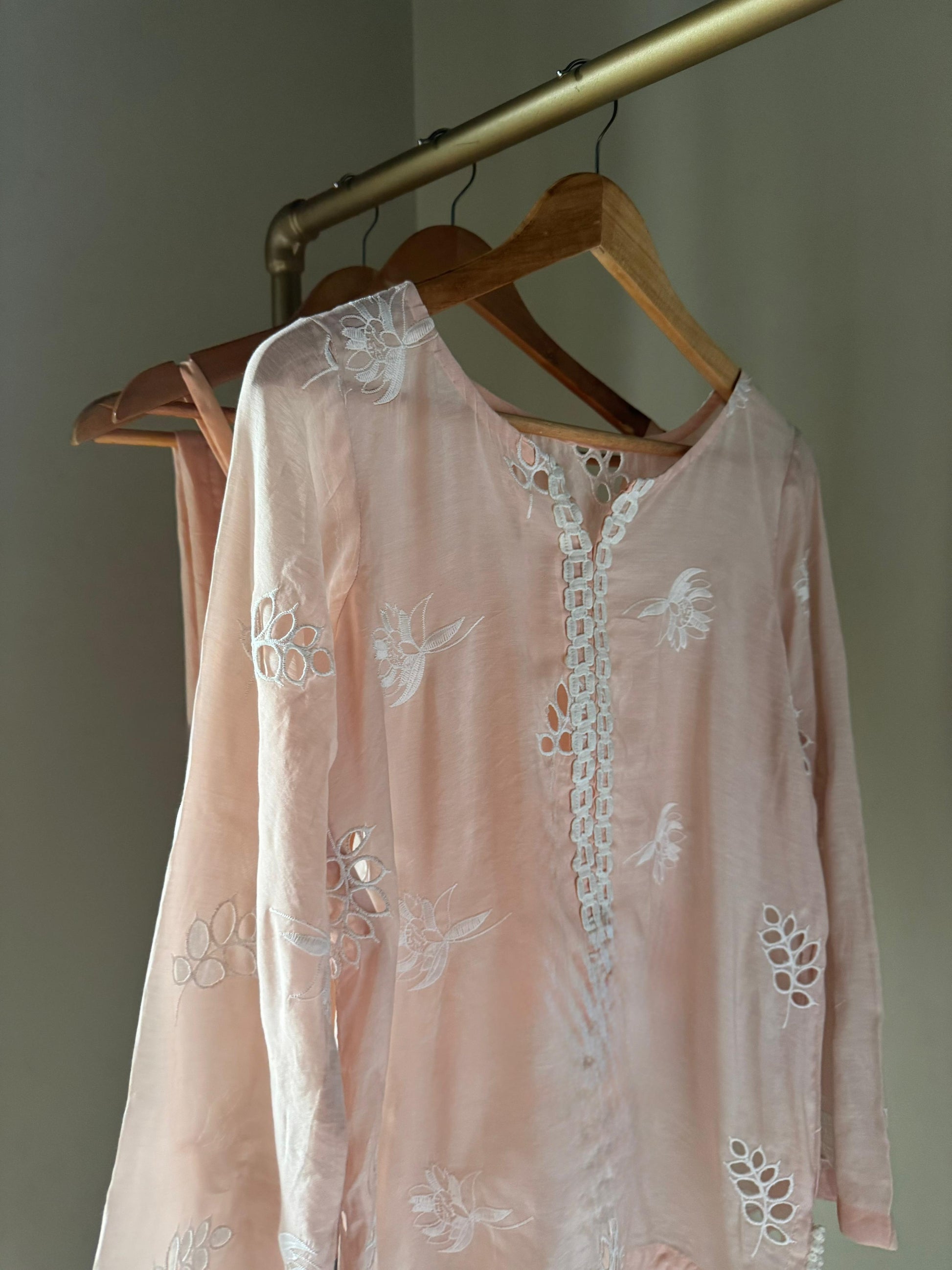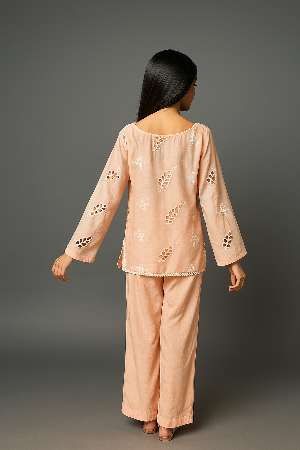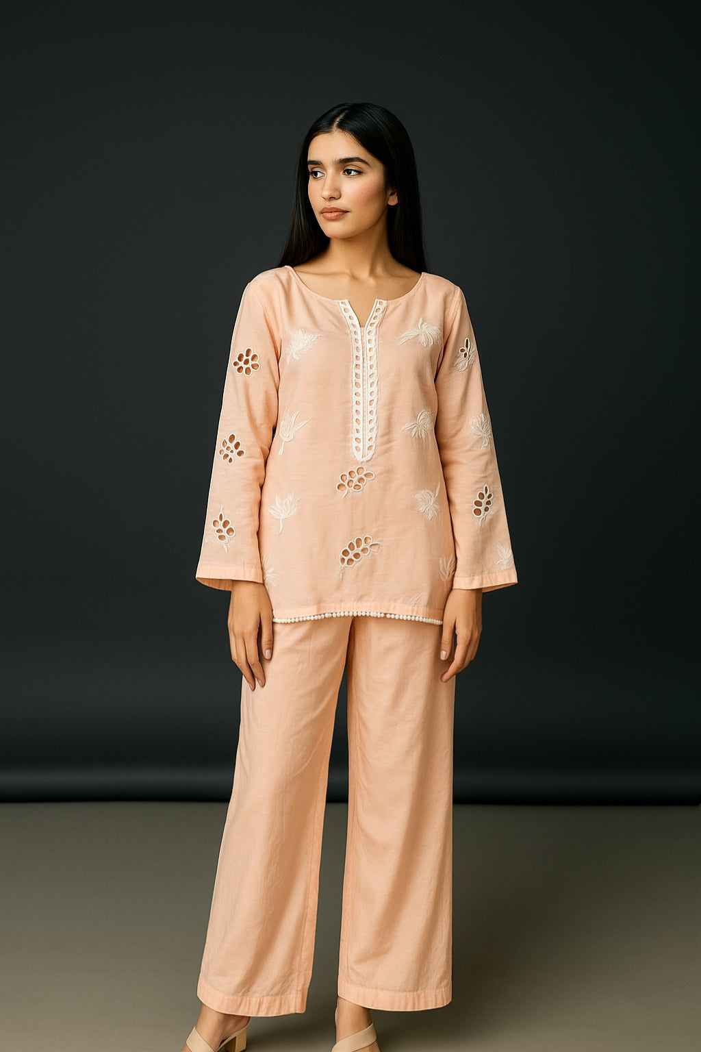 3-Piece Co-Ord Set – Laser Cut Kurti, Spaghetti Strap Slip & Straight Trousers | Mireej