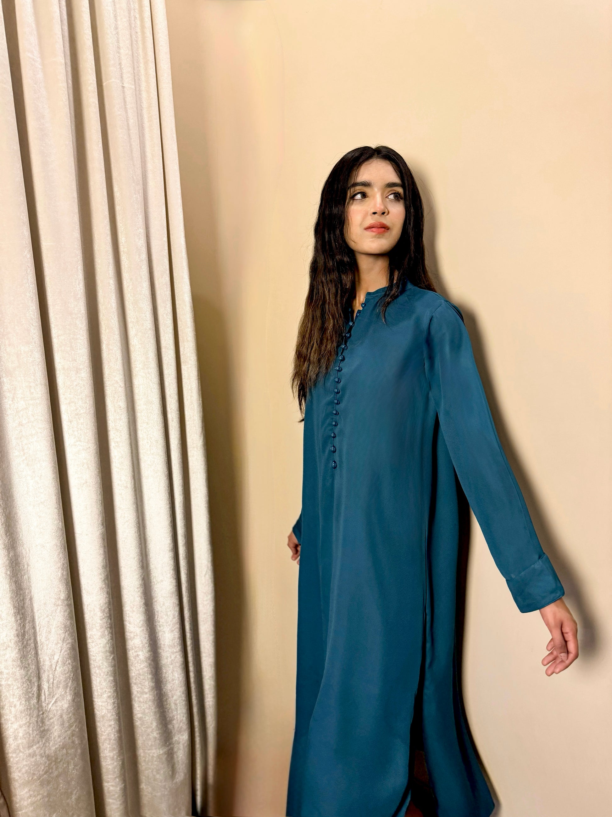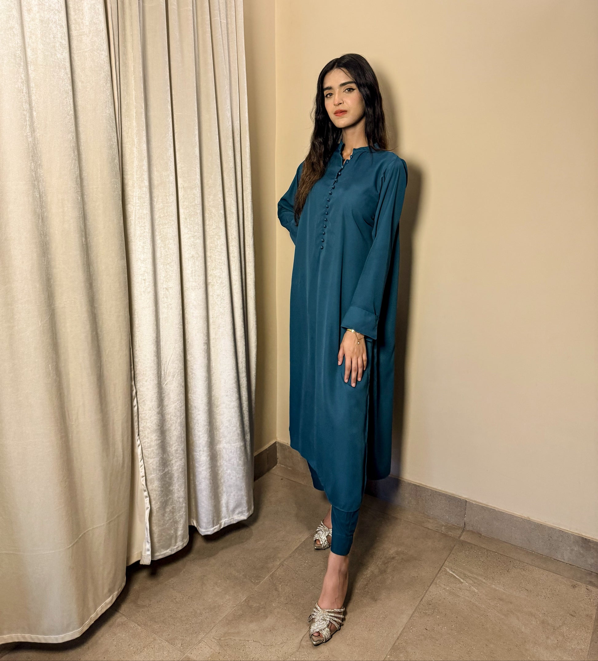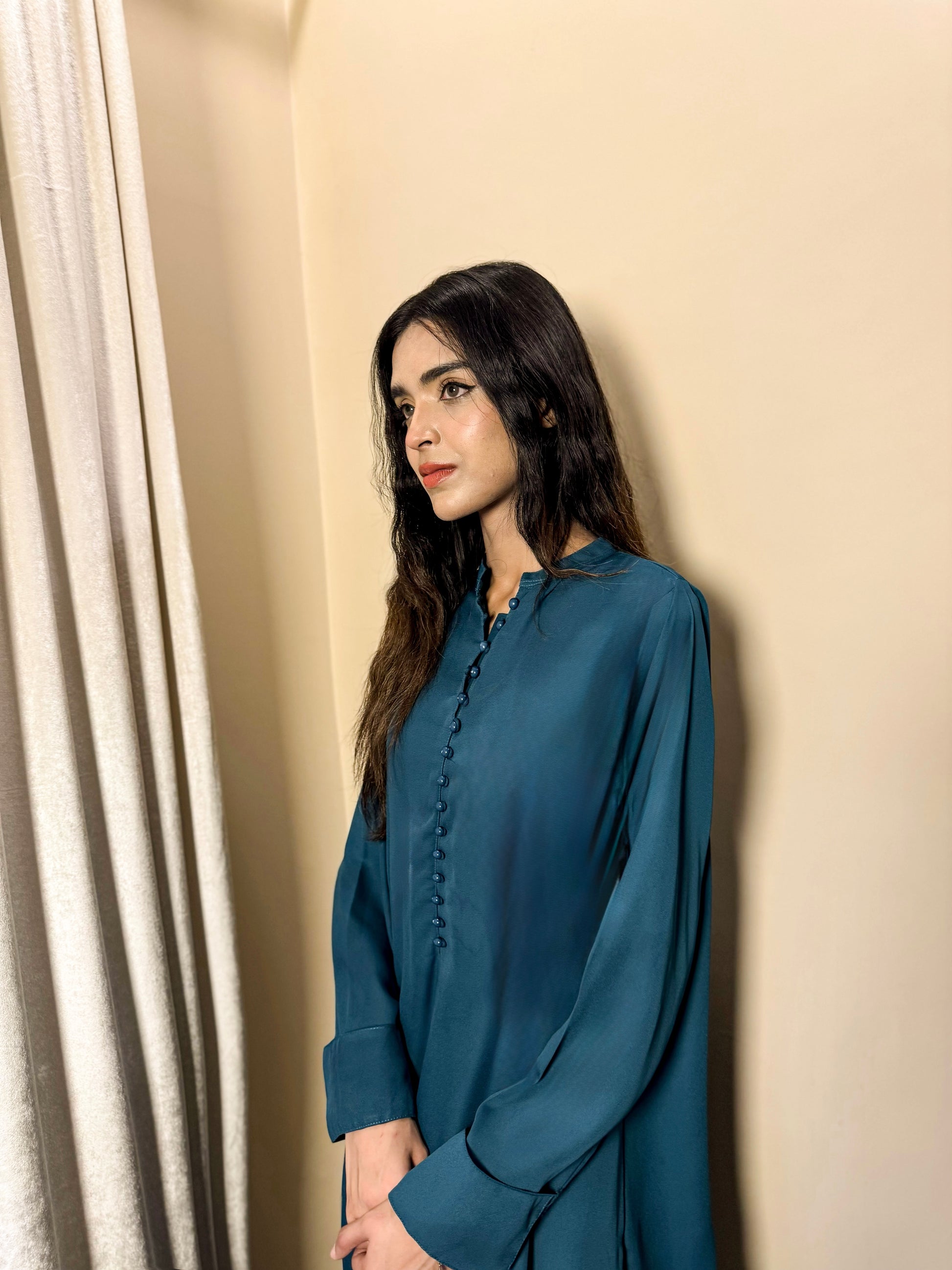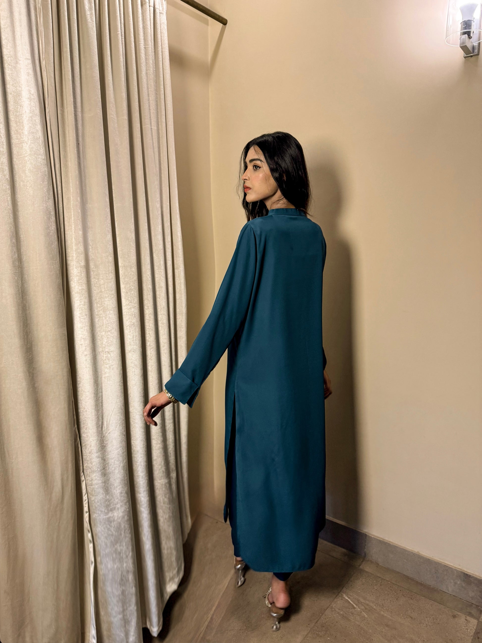 Elevate your everyday wardrobe with this teal minimal solid set a versatile two-piece crafted from a premium poly-cotton blend. Designed with a clean, straight-cut silhouette, full sleeves, and fabric-covered buttons, it transitions seamlessly from office hours to after-work dinners. The rich teal shade offers a refined yet understated vibe, perfect for minimal styling lovers.