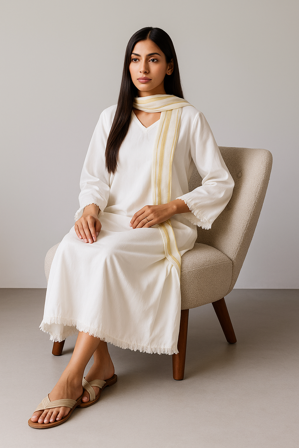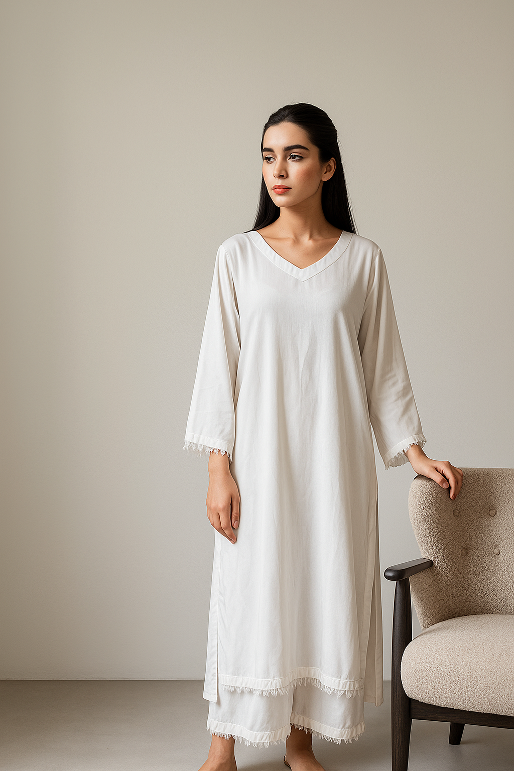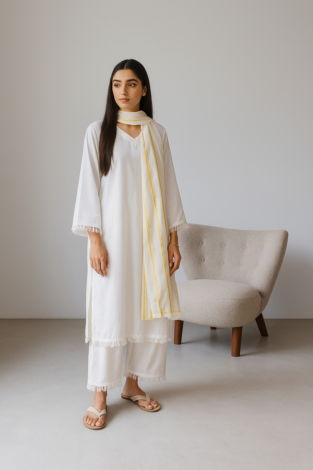 Elevate your everyday wardrobe with Swan Solid, a timeless two-piece set crafted in premium crepe. Designed for effortless elegance, this minimal white co-ord offers a relaxed yet refined silhouette, perfect for monsoon lunches, office days, or weekend gatherings. The soft drape and fringe hem add subtle texture, making it a versatile staple you can style season after season.